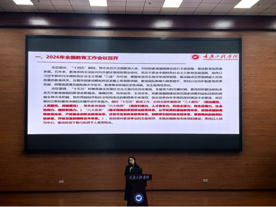 会上,刘子菱书记带领全体教职工学习2026年全国教育工作会议精神,重点领会做好“十五五”教育工作,必须全面把握教育“三大属性”,聚焦教育强国“六大特质”“八大体系”。围绕区域教育发展布局,学习了重庆市教育委员会等8部门印发的《重庆市推动“人工智能+教育”行动方案》的相关内容。全体教职工深入了解重庆“人工智能+教育”的阶段目标,以及升级人工智能基础环境、建设人工智能应用场景、构建人工智能创新生态、促进人工智能素养提升、筑牢人工智能安全屏障等5大重点任务,并结合当前学校和学院改革发展中心工作,重点对创新“人工智能+”教学形态、推动“人工智能+”科学研究、强化“人工智能+”教育评价等内容进行解读和强调。