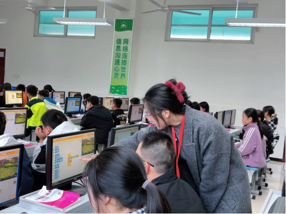 课堂上,志愿者们通过Scratch图形化编程软件,带领孩子们亲手制作“小猫追蝴蝶”“海底世界”等趣味小游戏。当看到自己设计的动画在屏幕上“动”起来时,孩子们兴奋地拍手欢呼。此外,在活动前期,学院向全体师生发出倡议,号召大家将闲置的课外读物、科普图书、文学名著捐赠出来,为乡村小学建立“爱心图书角”。倡议发出后,师生积极响应。学院教师捐赠了科普读物,学生则拿出自己珍藏的童话故事、儿童文学。这份沉甸甸的关爱将为孩子们打开一扇通往广阔世界的窗。”