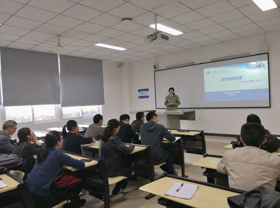 钱老师以“精彩一课”为例,向各位新老师介绍了如何对一门课程进行合理的设计。她谈到首先应当对课程进行充分的分析,在认真学习人才培养方案的基础上,将所受课程的性质、开课时间、教学目标和学情理清楚再进行教学设计。随后钱老师讲解了教学设计的要素,包括教学思路、课时分配、重难点、教法学法、考核方式等,所有的设计都应该有其理论依据,并且教学设计要达到的成果就是实现教学目标。最后钱老师介绍了在平时说课和参加教学竞赛时应当注意的问题。
