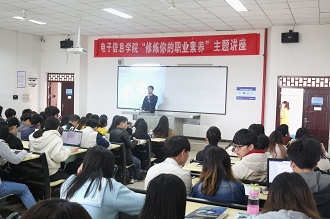 首先,由电子信息学院团委书记兼学生工作室主任李尚伦老师为此次讲座做了一个暖场。讲座一开始,杨皓军老师首先做了一个简单的自我介绍。之后,杨老师主要讲述了职场的基本三原则、需要掌握的职业能力以及如何修炼内功这三个方面的内容。期间,杨老师通过一系列的例子用通俗易懂的语言加深了同学们对职业素养的认识。最后,杨老师引用黄政宇老师《终身学习》中的“只有持续学习才能使人生趋于完美”这一句话为此次讲座画上了完美的句号。