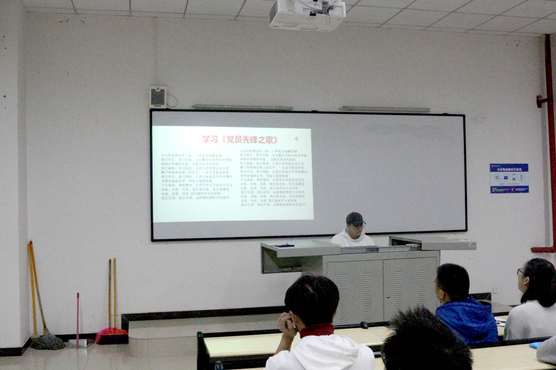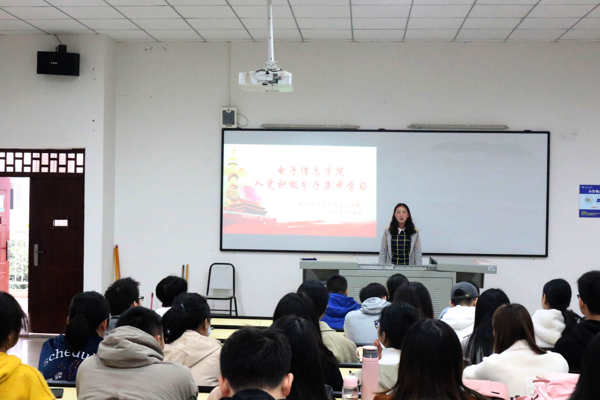 会议伊始,李贵容同志向各位入党积极分子进行了学院风采展示。随后,李贵容同志向大家推荐了《学习强国》这一款由中共中央宣传部推出的学习党的理论知识的软件,提供学习平台,用以提高党性修养。最后,李贵容同志着重强调了阅览室学习的相关规定,提醒大家要严格遵守规则。会议接近尾声时,由文腾森同志带领大家练习《党员先锋之歌》,在场的每一位同志都激情昂扬,歌声回旋在六教久久难以散去。