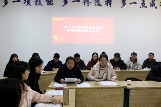 大会由电子信息学院学生党支部书记宋文轩同志主持,会议内容是讨论关于接收刘峻夷等12名同志为预备党员的问题。首先,刘峻夷等12名同志在大会上汇报了自己对党的认识、入党动机、现实表现,介绍了个人政治背景和成长经历。入党介绍人也对刘峻夷等12位同志的现实表现以及考察情况向大会和全体党员进行了汇报。