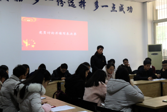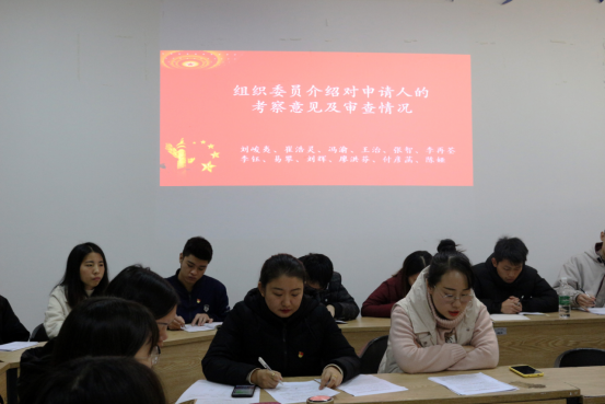 接着,电子信息学院党总支组织委员郭晓伟同志报告了12名同志的审查情况,现场对刘峻夷等12名同志的入党问题进行了讨论,参会党员也发表了意见。最后的无记名投票表决结果为:同意接收刘峻夷等12名同志为预备党员。随后学院副院长景兴红同志对参会的所有党员提出了三点期望:第一,实事求是,结合实际解决问题,要时刻保持积极性和主动性;第二,明白党员不只是一种身份,更重要的是需要极高的责任感和使命感,向身边的同学传递正能量;第三,党员同志要加强和入党介绍人的沟通交流,让老师能更好的了解同志们相应的状况。