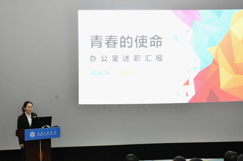 而后,主席团成员作述职报告,各位成员分别表明自己的本职工作,顺着本职工作的线指出自身工作中的不足,并对学生会全体成员讲述自己的期望,主席团成员总结各部门代表总结中的通病,并进行思想纠正,传达对学生会全体成员的工作期望--求真务实、打磨自身与坚持拼搏。
