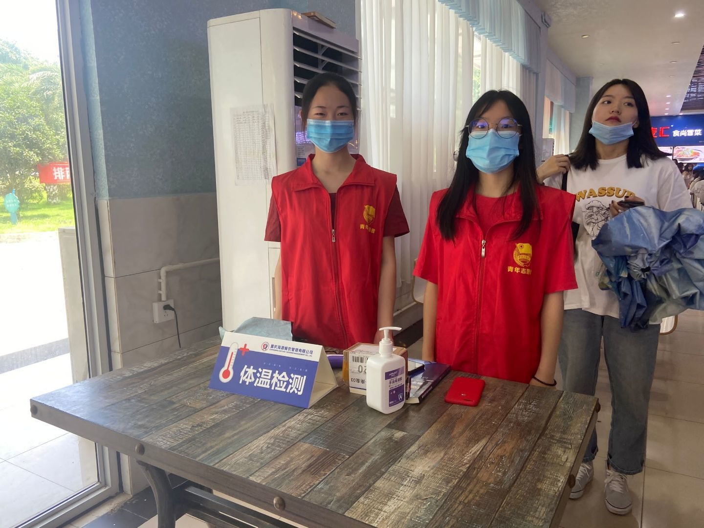 安排志愿者站岗,目的是为了提醒同学们进入食堂要佩戴好口罩,确保自身的安全,并在就餐前再取下。就餐时分开坐,少交流,专心吃饭,吃完就走,错开就餐高峰期。疫情还没彻底结束之前,我们一刻也不能放松,所以还是要安排青年志愿者们对同学们进行监督,保证大家的安全。