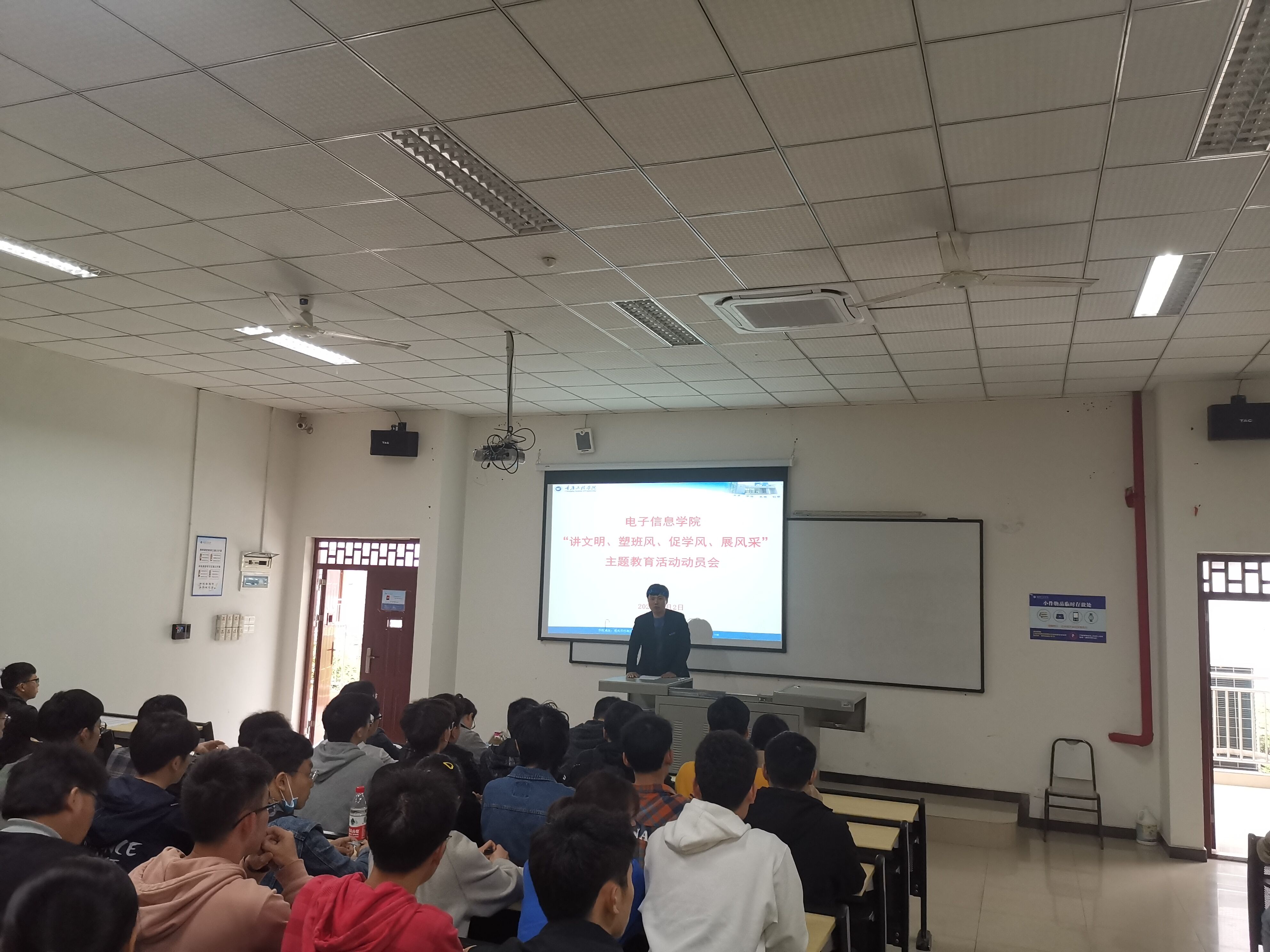 为积极响应和贯彻落实学校“两个问好”主题教育宣传活动和进一步积极推动“红蓝绿”班级文化建设,电子信息学院于2021年4月2日中午12:30分在6教202教室开展“讲文明、塑班风、促学风、展风采”主题教育活动,学院党总支书记谭思宇、全体辅导员老师、全体团学干部以及2018级、2019级班委干部代表参加了本次动员会。会上学生科长景晖祥宣读了电子信息学院关于实施“两个问好”的通知,党总支书记谭思宇重点解读了“红蓝绿”班级文化建设方案并对此项工作作安排部署。