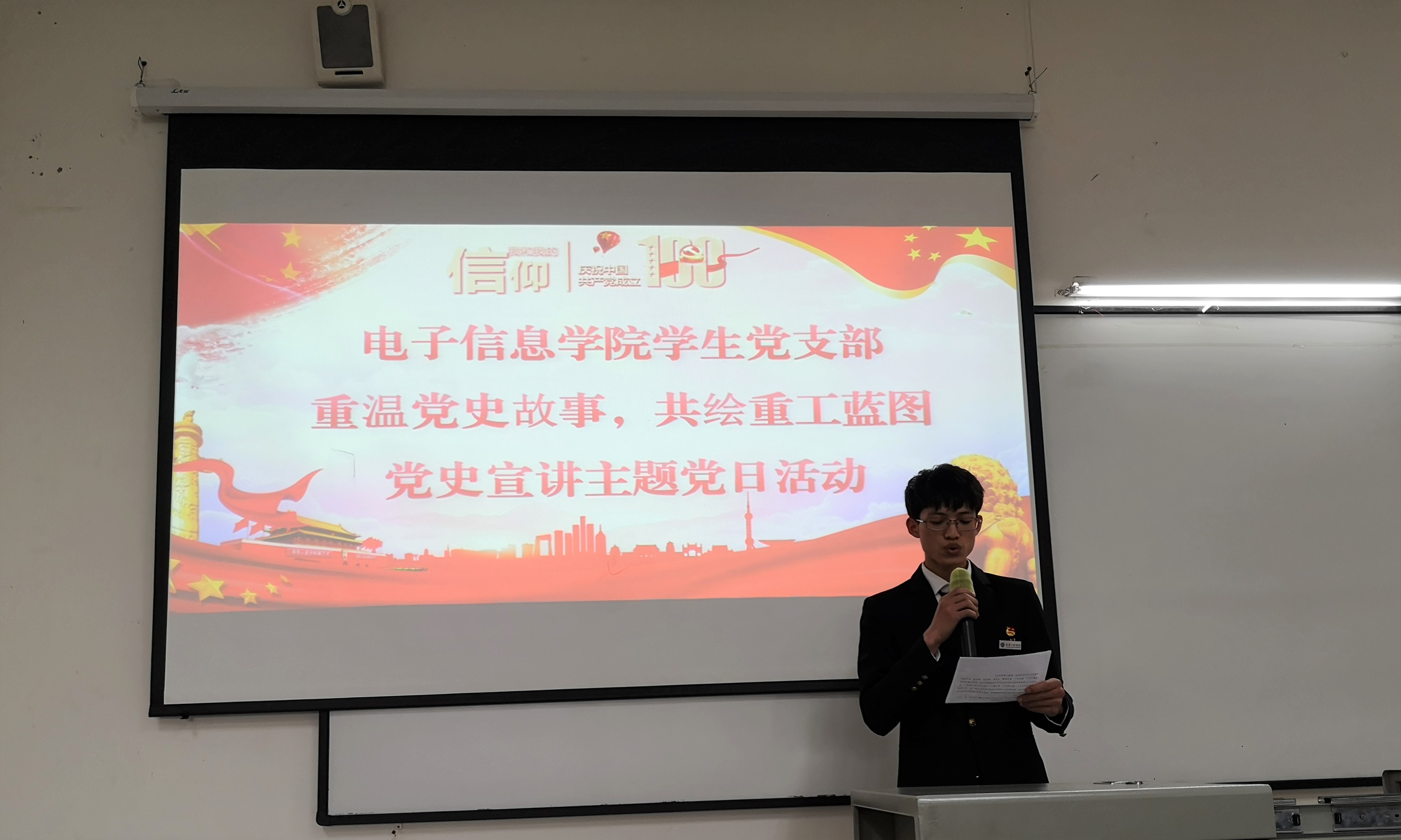 2021年4月29日中午12:30在六教201教室,宣讲团成员在建党100周年和建校20周年之际以“重温党史故事,共绘重工蓝图”为主题从红船精神、红岩精神、五四精神等党的故事面向学院全体党员、入党积极分子共计近200余名同学进行第一场宣讲。后续,宣讲团还将走进晨课、走进班级、走进社区等形式开展丰富多样的党史宣讲。
