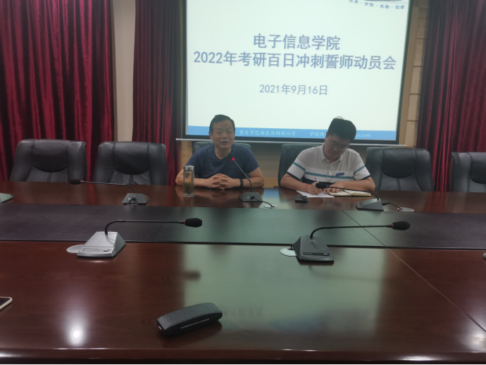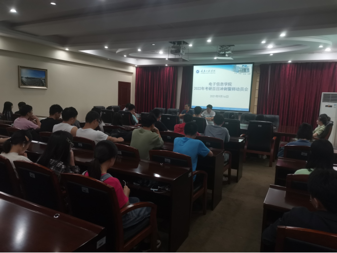 为进一步加强学风建设,全面调动学生考研积极性,明确考研目标,提升考研竞争力,电子信息学院2021年9月16日18:30在第七会议室召开2022届考研百日冲刺誓师大会。会议由学院党总支书记谭思宇主持,2018级全体考研同学参加会议。