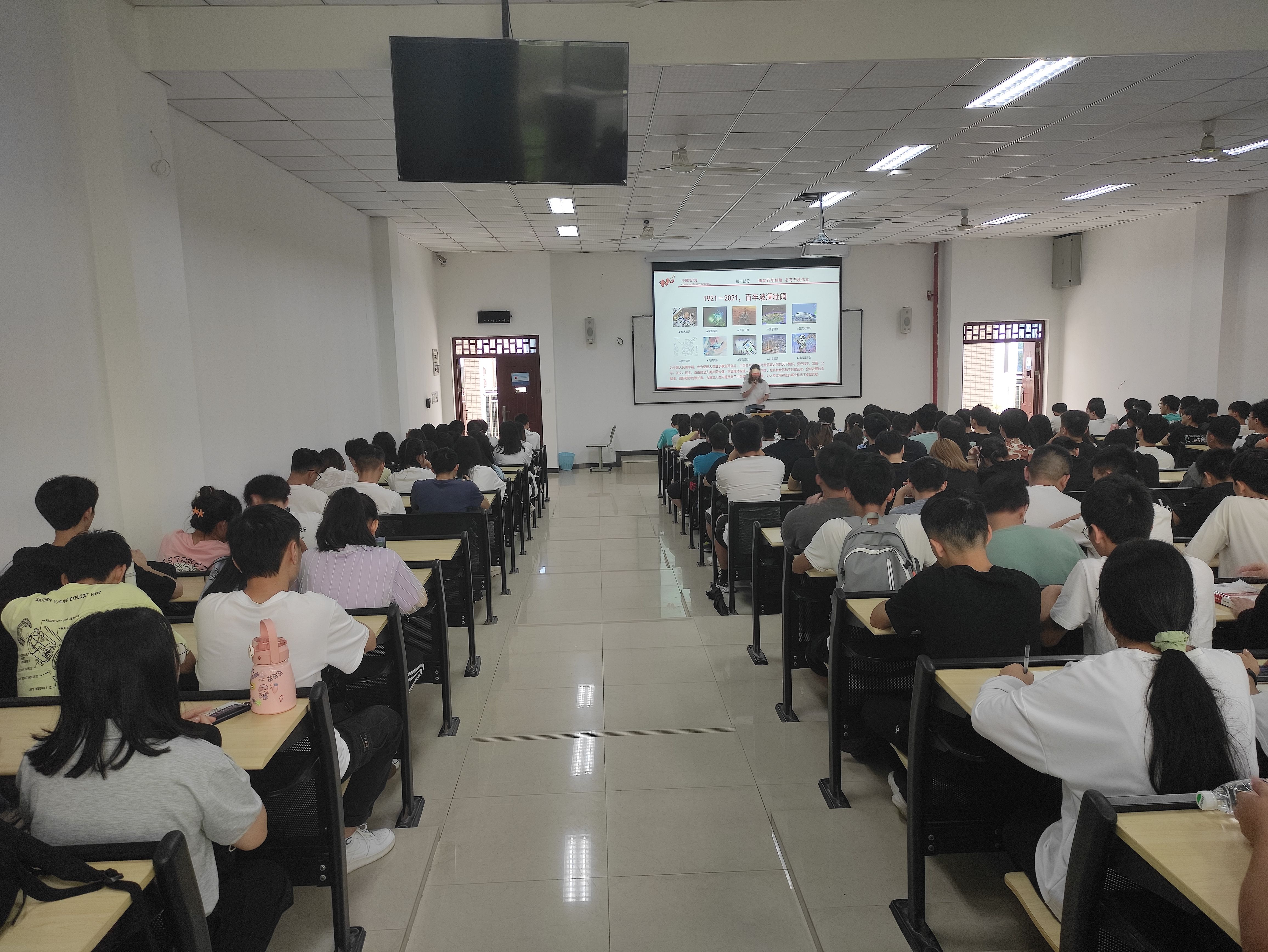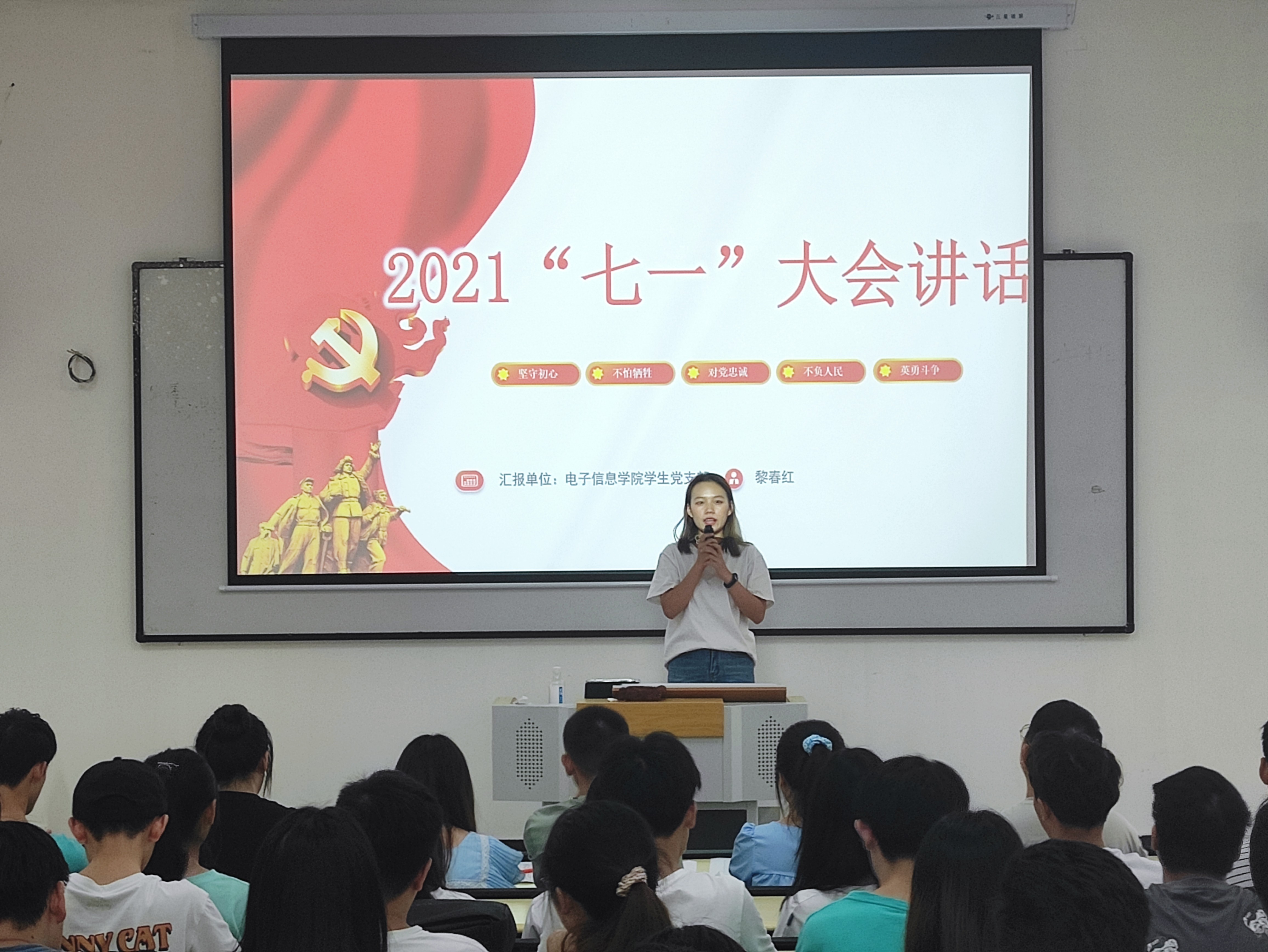 电子信息学院党员实践教育中心考核督察部干事黎春红同学主持讲解习近平总书记在中国共产党成立100周年大会上的重要讲话精神,引导同学们把思想和行动统一到讲话精神上来,将学史明理、学史增信、学史崇德、学史力行贯穿起来,运用到学习和生活中。