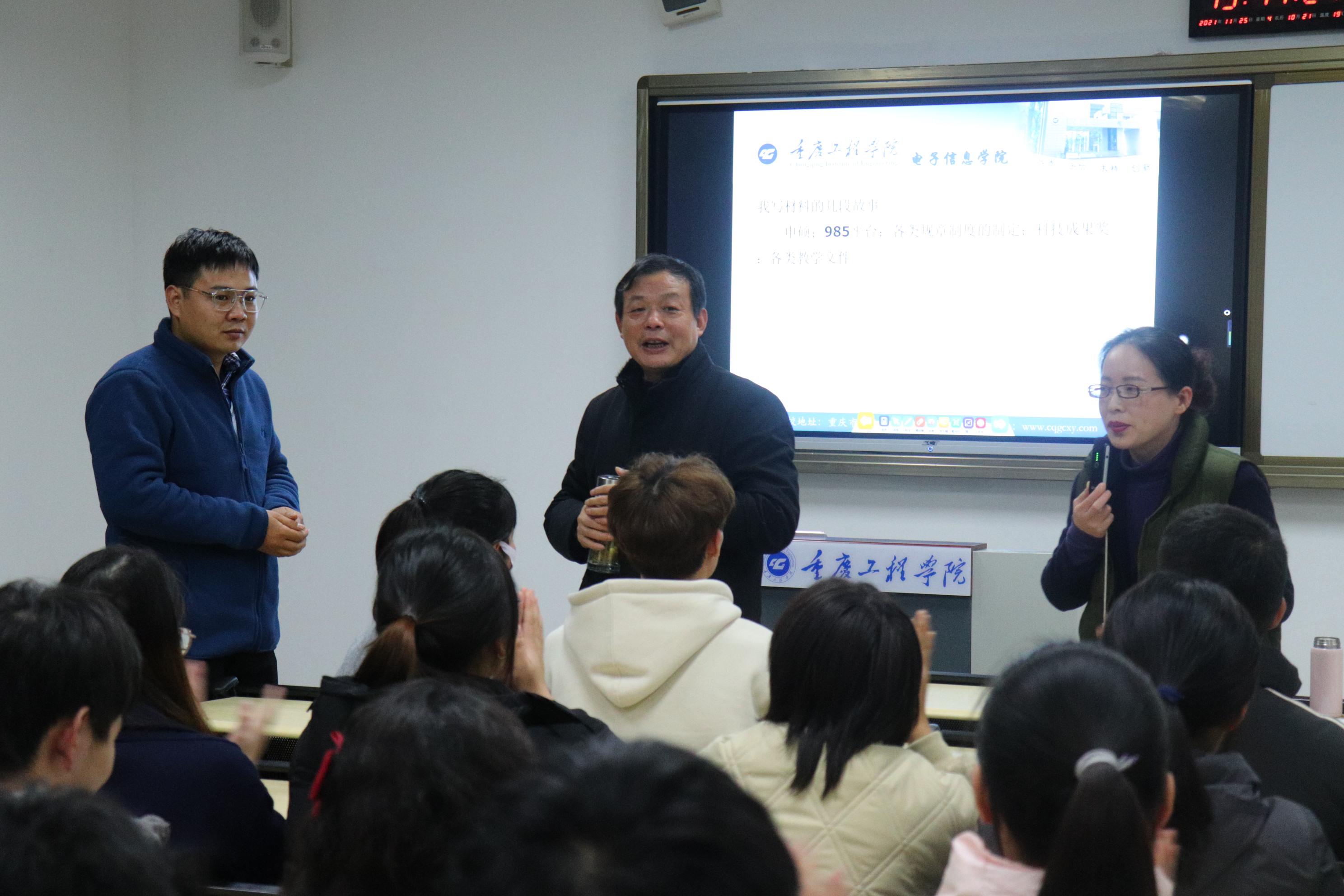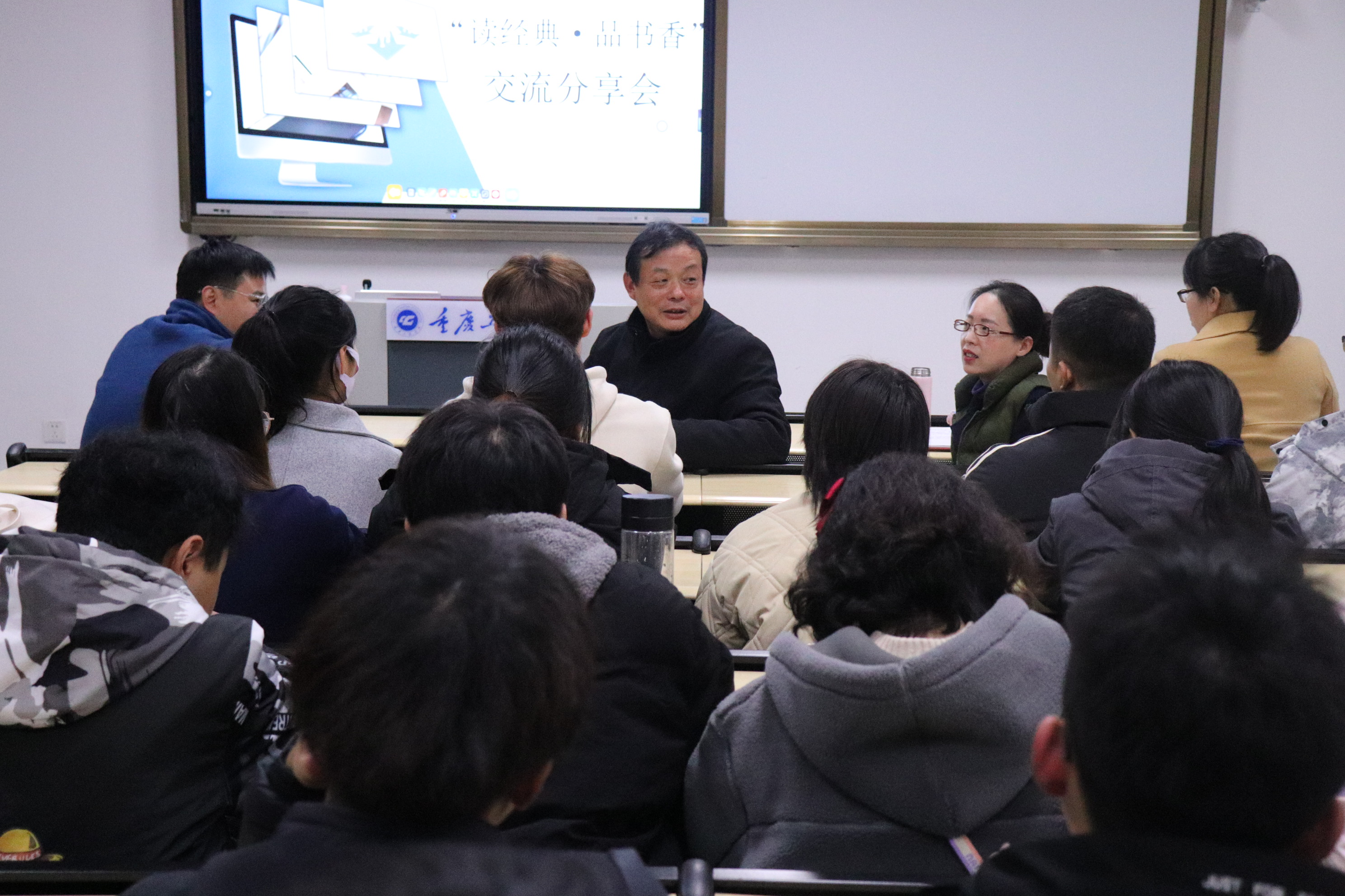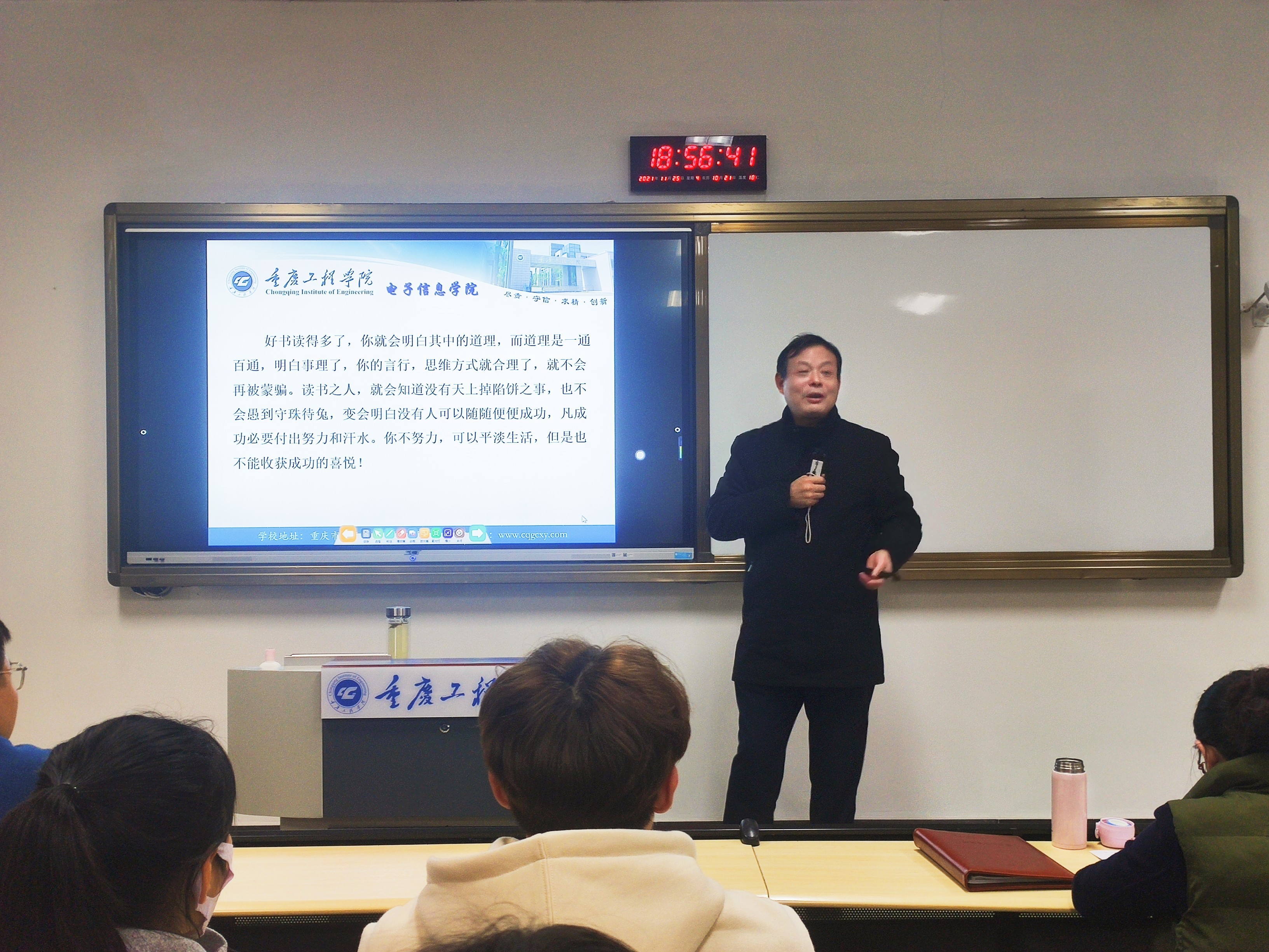 分享过程中,何院长用平易近人的语调和同学们热情互动,循循善诱,教导大家养成“读好书、好读书”的阅读习惯;用深厚的文化底蕴为在场的所有同学展示了来自电子信息学院的浓厚书香气息。活动现场,全场师生集体背诵《岳阳楼记》,更是将整场活动推向高潮。