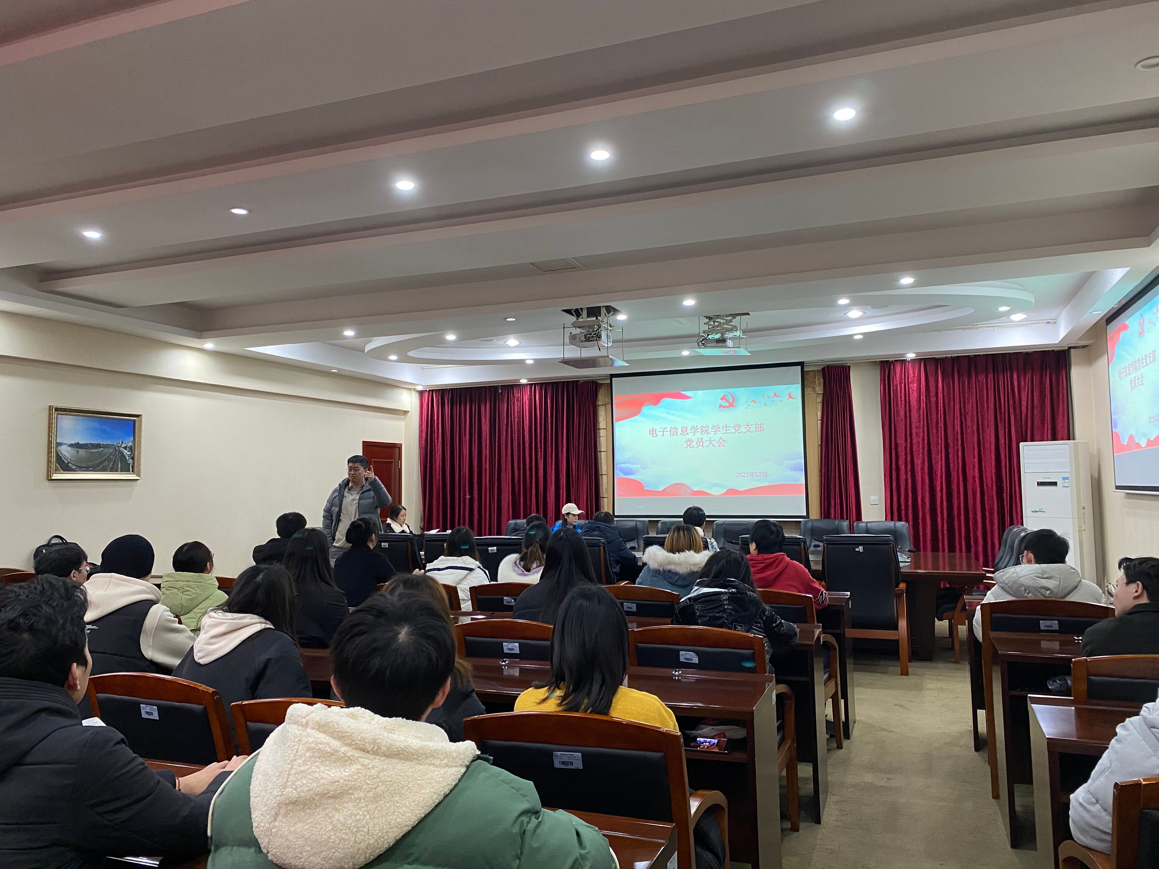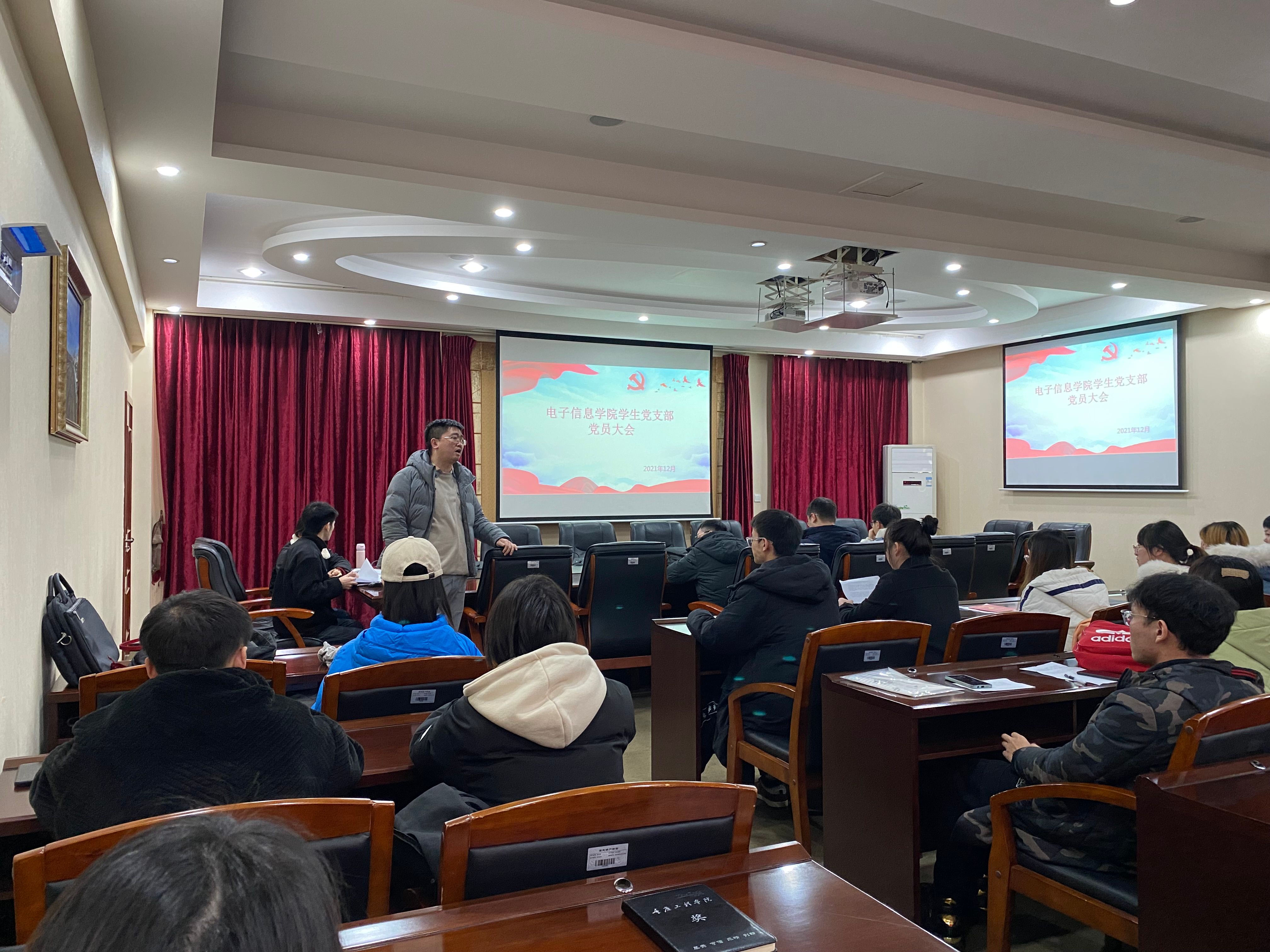 2021年12月29日,电子信息学院学生党支部在第七会议室召开党员大会,电子信息学院党总支书记谭思宇同志和电子信息学院全体学生预备党员及正式党员参与此次会议。