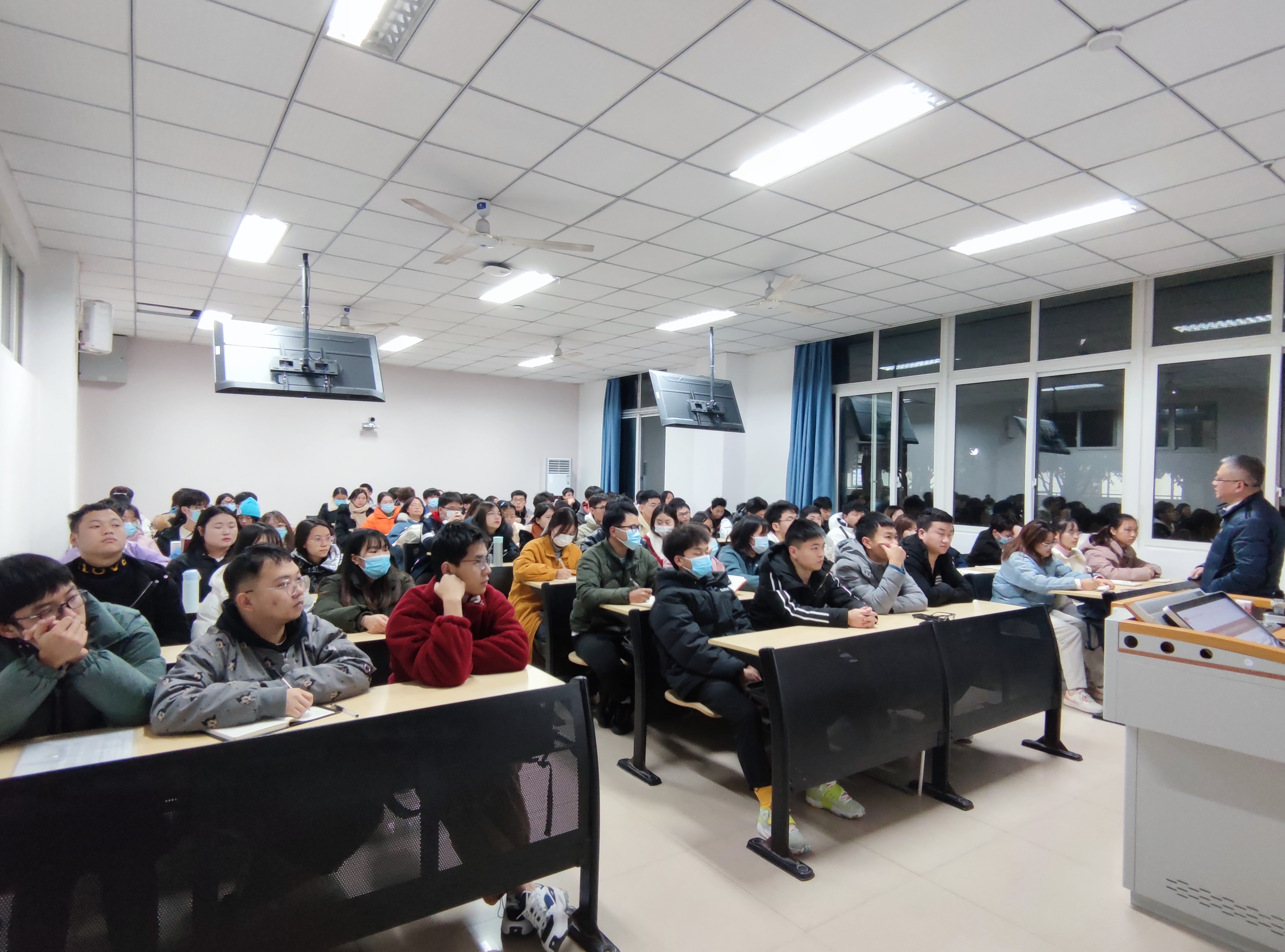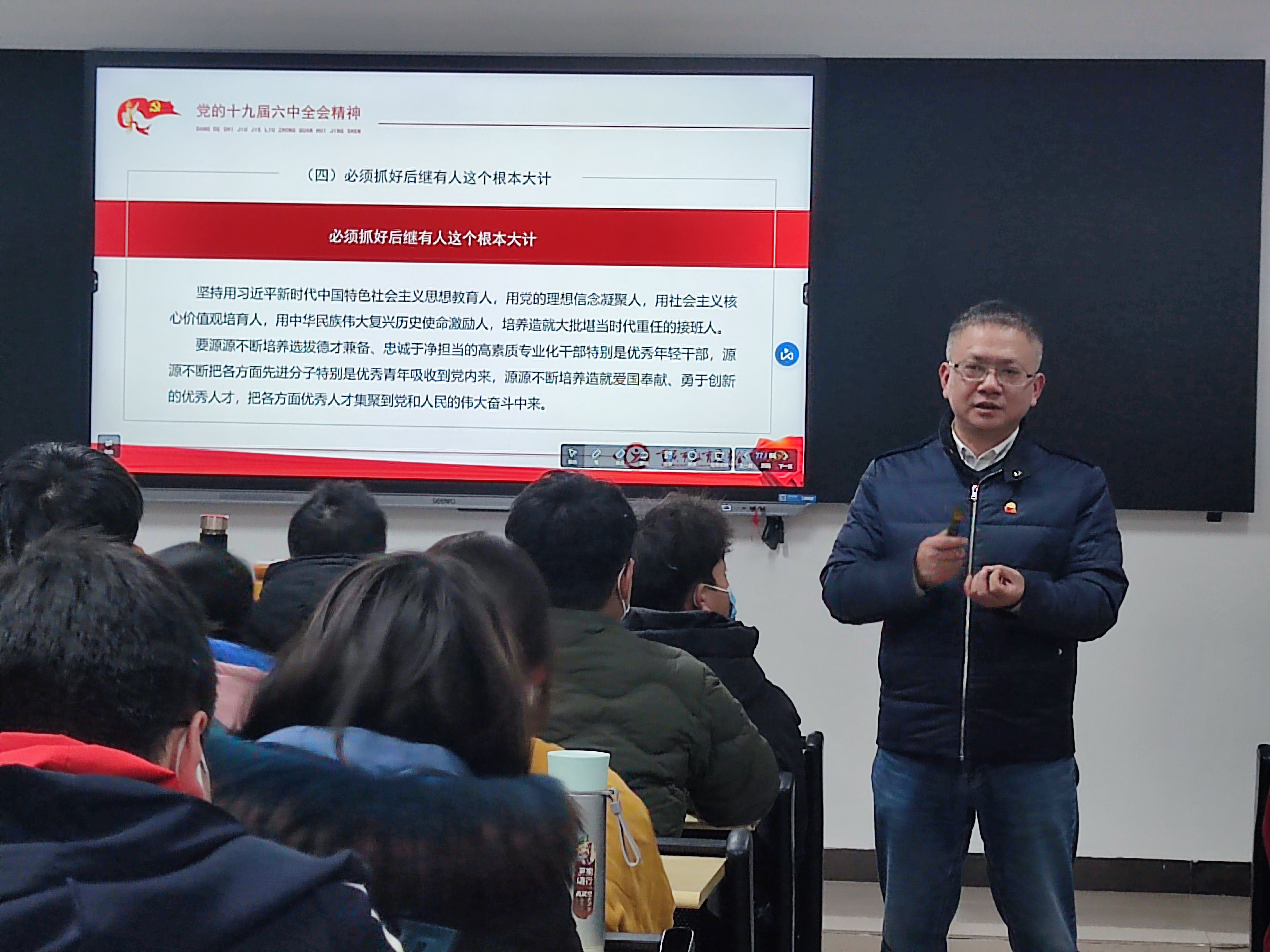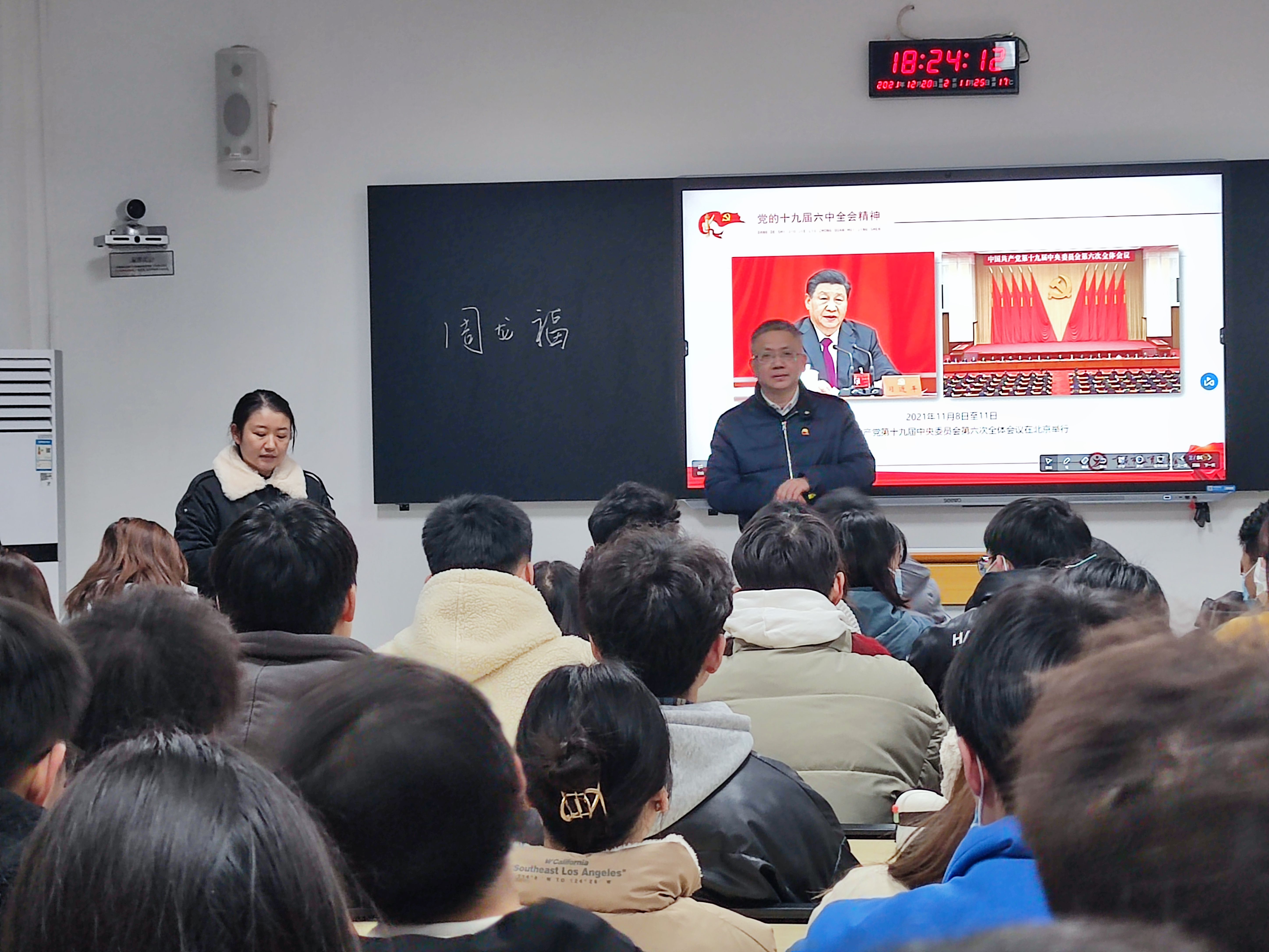 2021年12月28日18:30,电子信息学院在6110教室开展学习贯彻十九届六中全会精神宣讲会,校党委委员、校长助理周龙福同志主讲,电子信息学院学生第一党支部书记宋文轩同志主持,正式党员、预备党员、发展对象、入党积极分子共计88人参加。