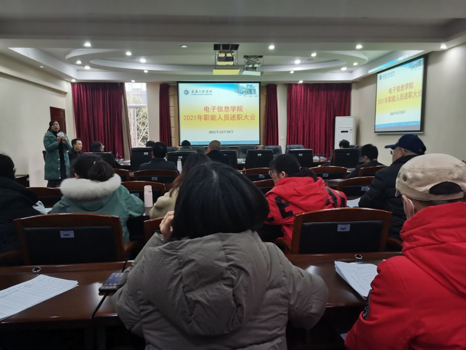 2021年12月29日,电子信息学院2021年职能人员述职大会在第七会议室顺利召开。学院院长何世彪、书记谭思宇、副院长景兴红、陈成瑞以及全体教职工共计50余人参加会议。