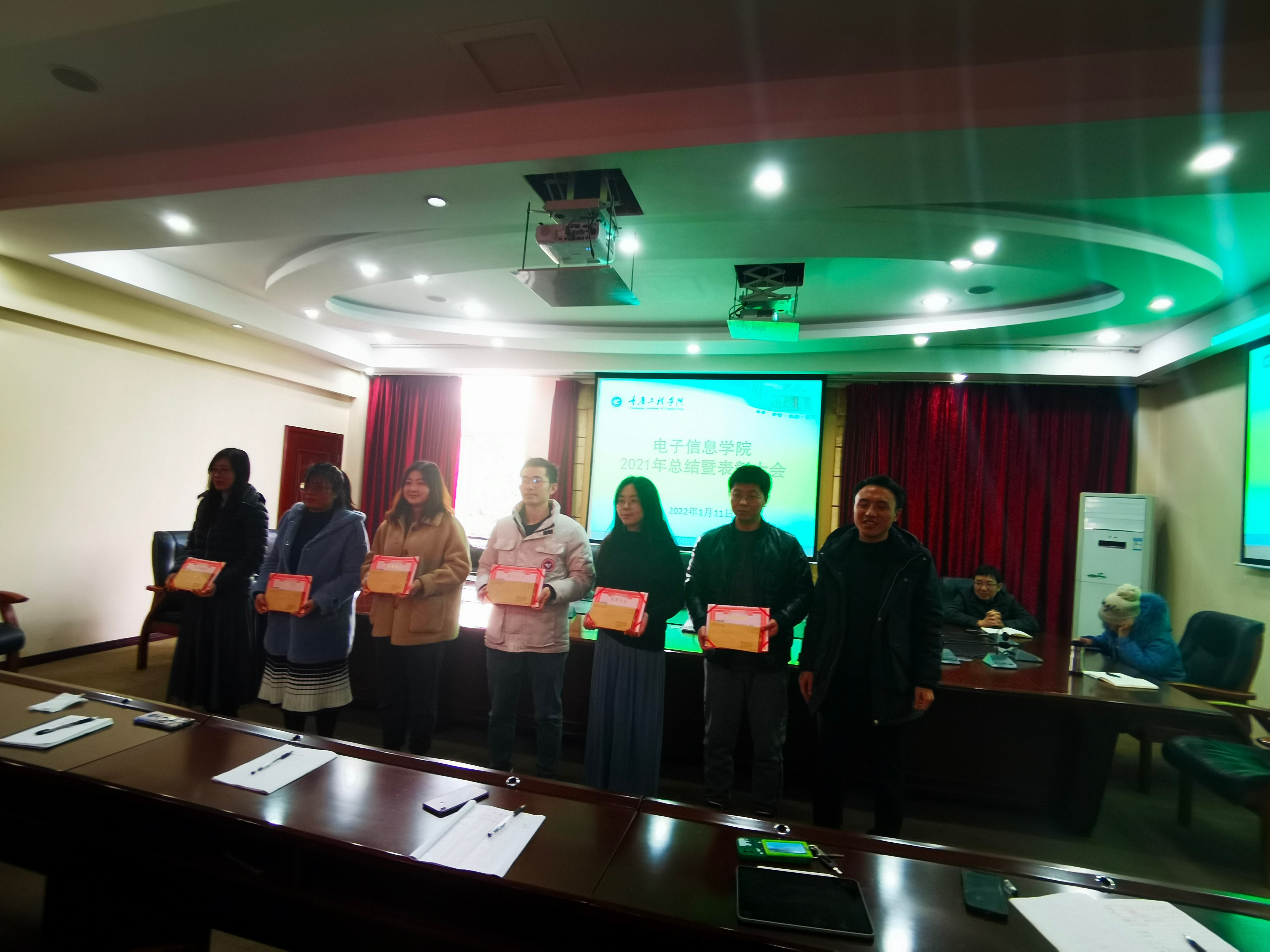 会上,谭思宇书宣读《电子信息学院关于表彰2021年度优秀个人的决定》,对一年来我院教师在科研学术、学生竞赛、教学竞赛、辅导员素质能力大赛、青年教师磨课组织等教育教学岗位上辛勤工作、无私奉献、并取得突出成绩的李翠锦等14位老师进行表彰并颁发证书与奖金,号召全体教职工向受表彰的同志学习,以他们为榜样,热爱教育事业以更加饱满的工作热情投入到教育教学中。