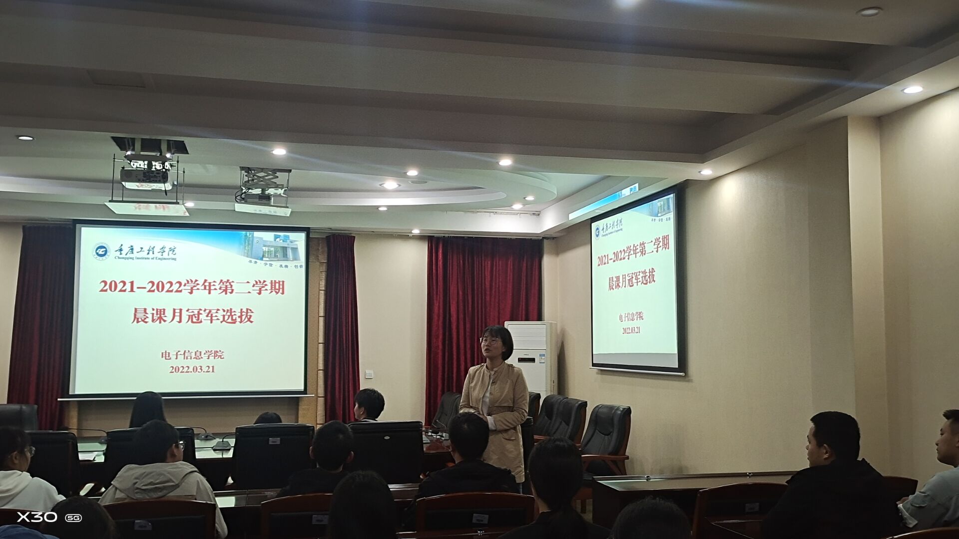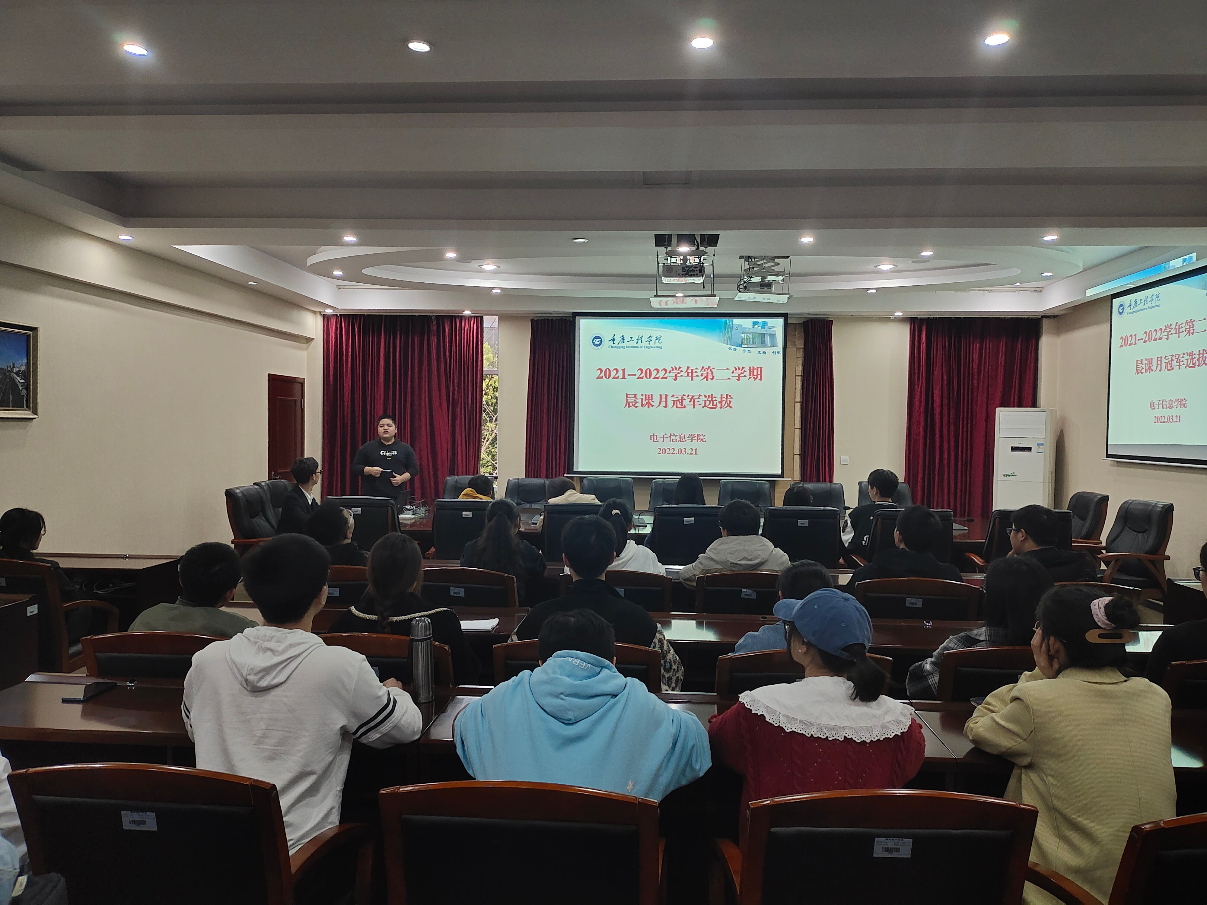 3月21日,电子信息学院晨课教研组在办公楼第七会议室举行了2021-2022学年第二学期《演讲与口才》第一轮晨课月冠军选拔,本次活动有20级晨课负责人肖璐老师、辅导员孙美晨老师参加,同时邀请了19级学长黄啓洋、叶茂,学姐何丽瑶进行点评并分享演讲经验。电子信息学院20级各班晨课助教和11位周冠军参加了本次选拔。