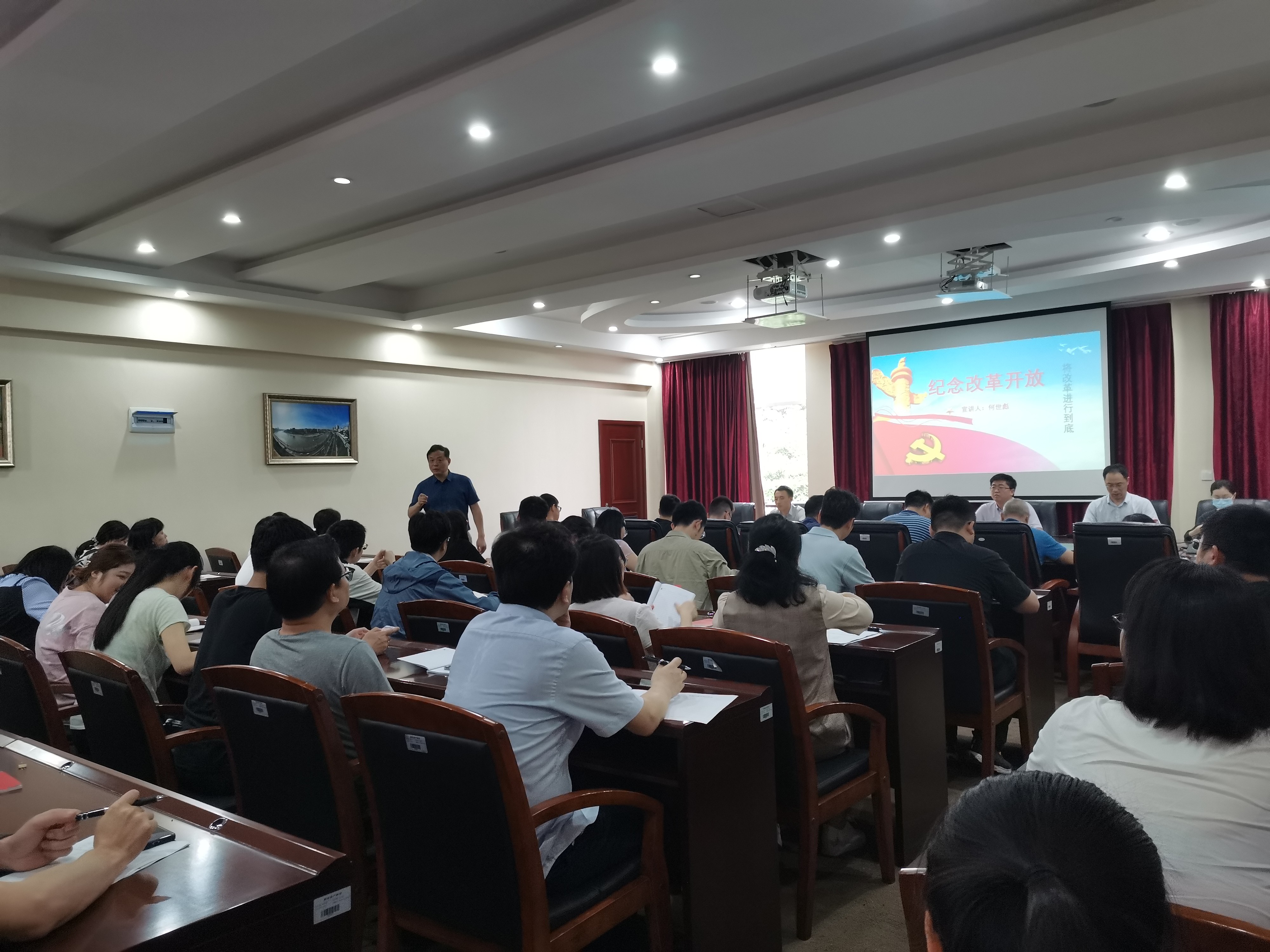 会上,何世彪同志从改革开放的背景、建设具有中国特色社会主义社会的改革开放历程、把工作重心转移到经济建设上来的具体措施、改革开放前后的对比以及对未来的展望等五个方面深入浅出的进行了讲解,使大家进一步认识到改革开放给中国人民面貌带来的历史性变化,这不仅仅是在生活水平的提高,还有精神生活和思想观念的巨大转变,“四个自信”在改革开放的过程中不断得到强化。