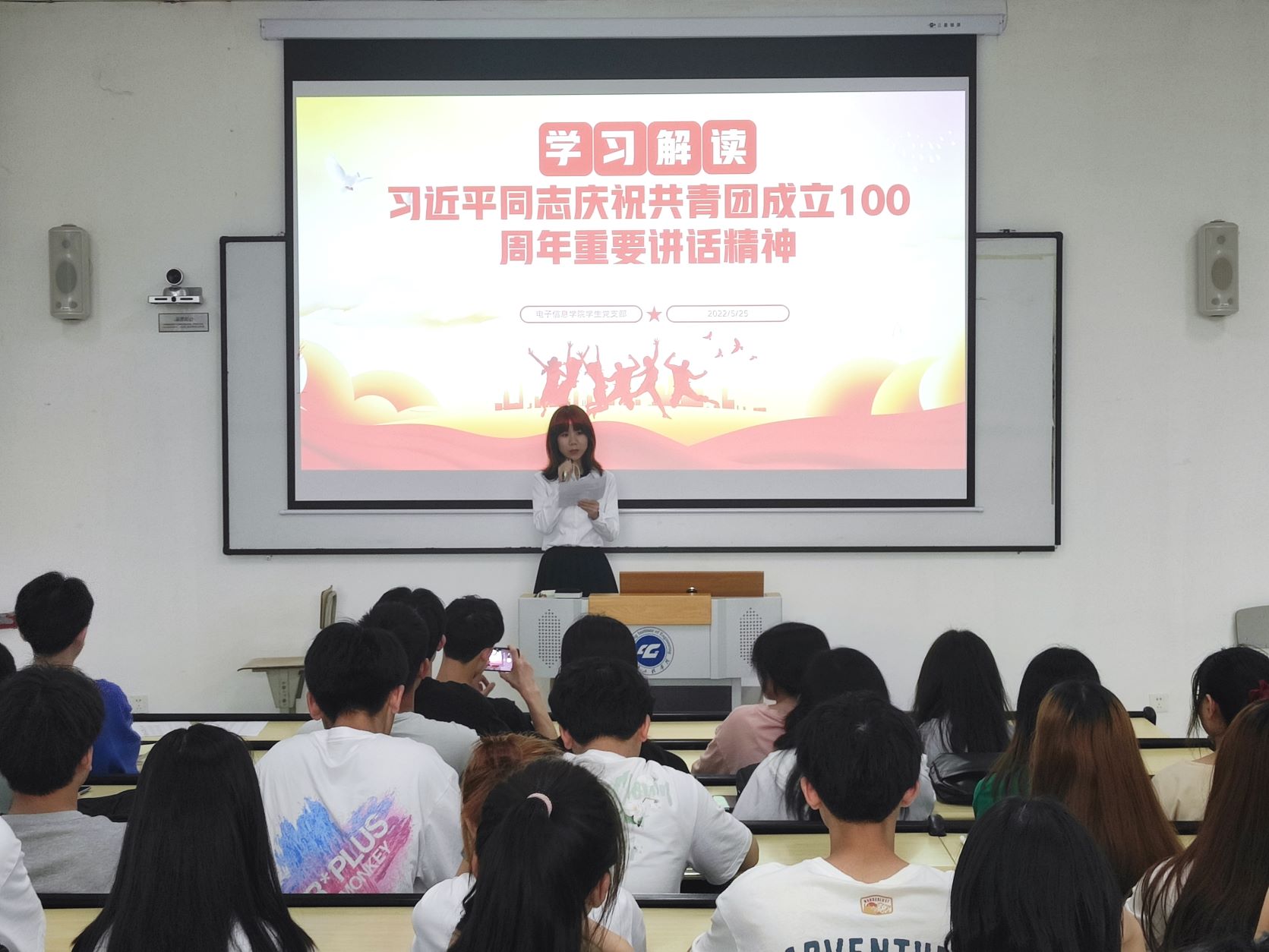 回望百年,青春向党。为加深青年学生对共青团的认识,增强新时代青年的责任感、使命感、荣誉感,5月25日,电子信息学院学生第一党支部、第二党支部联合开展“青春向党 百年风华”庆祝共青团成立一百周年主题党日活动,活动由沈鸿英同志主持,全体预备党员、发展对象、入党积极分子共计100人参与活动。