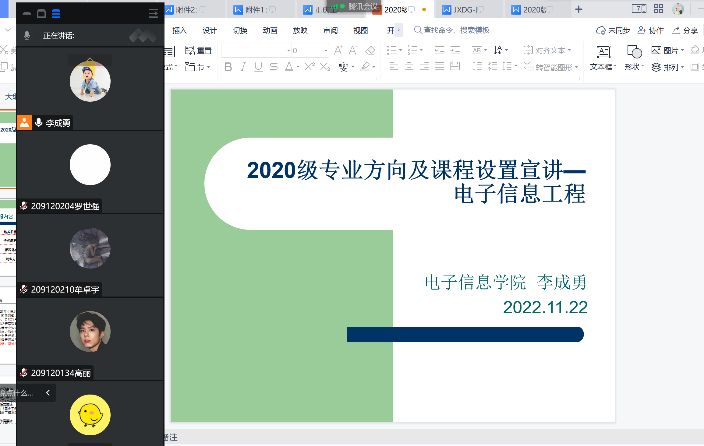 为了让2020级电子信息工程专业学生明白将要进行的专业方向的选择和人才培养方案中的课程设置情况,给同学们一些在选择专业方向的建议和指导。2022年11月22日18:30通过腾讯会议线上方式开展了关于“2020级专业方向及课程设置宣讲”的讲座。
