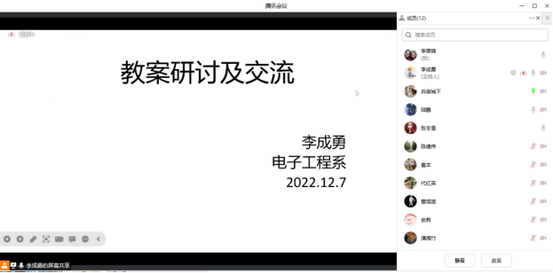 为了更好地确保本科教学质量,提升线上线下教学效果,2022年12月7日,电子工程系在腾讯会议平台召开了线上教案研讨及交流会。会议由李成勇主任主持,全系教师参会。