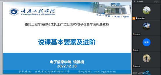 为加强我院师资队伍建设,更好地促进新教师的成长与发展,根据学院督导组相关工作安排,结合我院新进教师实际情况,2022年12月28日在线上开展交流活动。本次培训交流的主题为“说课基本要素及进阶”,由自动化系钱雅楠老师主讲,部分新进教师参与了此次活动。