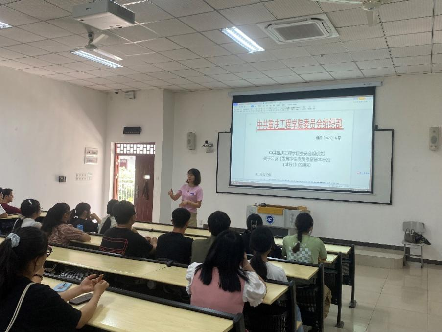 学生第二党支部支部书记肖璐带领全体参会的入党申请人、入党积极分子学习《重庆工程学院发展学生党员考察基本标准(试行)》,着重就考察内容、必备条件、加分细则进行了讲解;同时,强调每一个培养对象要牢记入党初心,并号召全体入党申请人、入党积极分子应时刻践行“坚定理想信念,争当模范先锋”的口号。