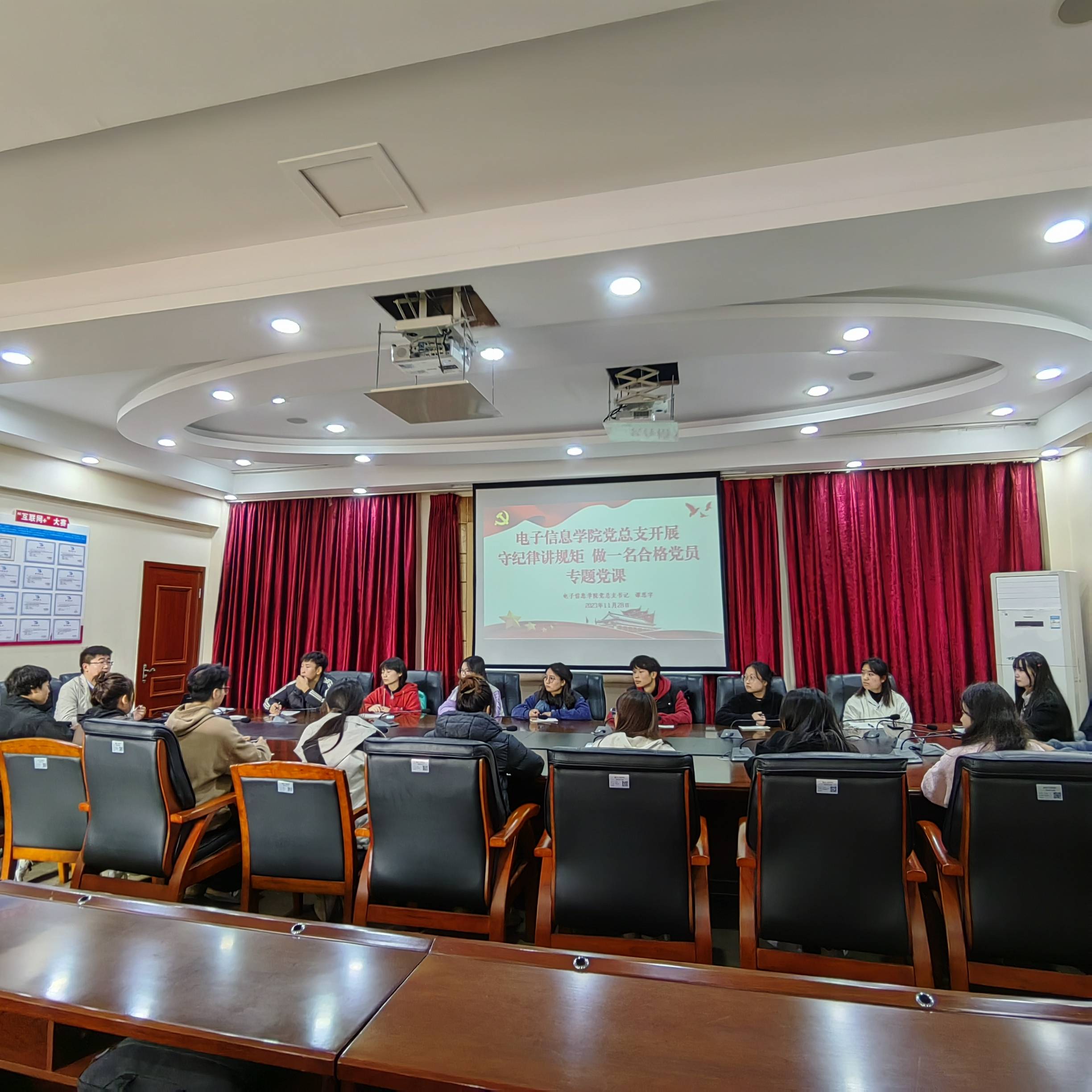 为深入推进新常态下的全面从严治党,提升发展学生党员工作质量,11月28日,电子学院党总支书记谭思宇在第七会议室讲授了一堂题为《守纪律讲规矩 做一名合格党员》的专题党课,学院学生第一、第二党支部共计20余人参加学习。