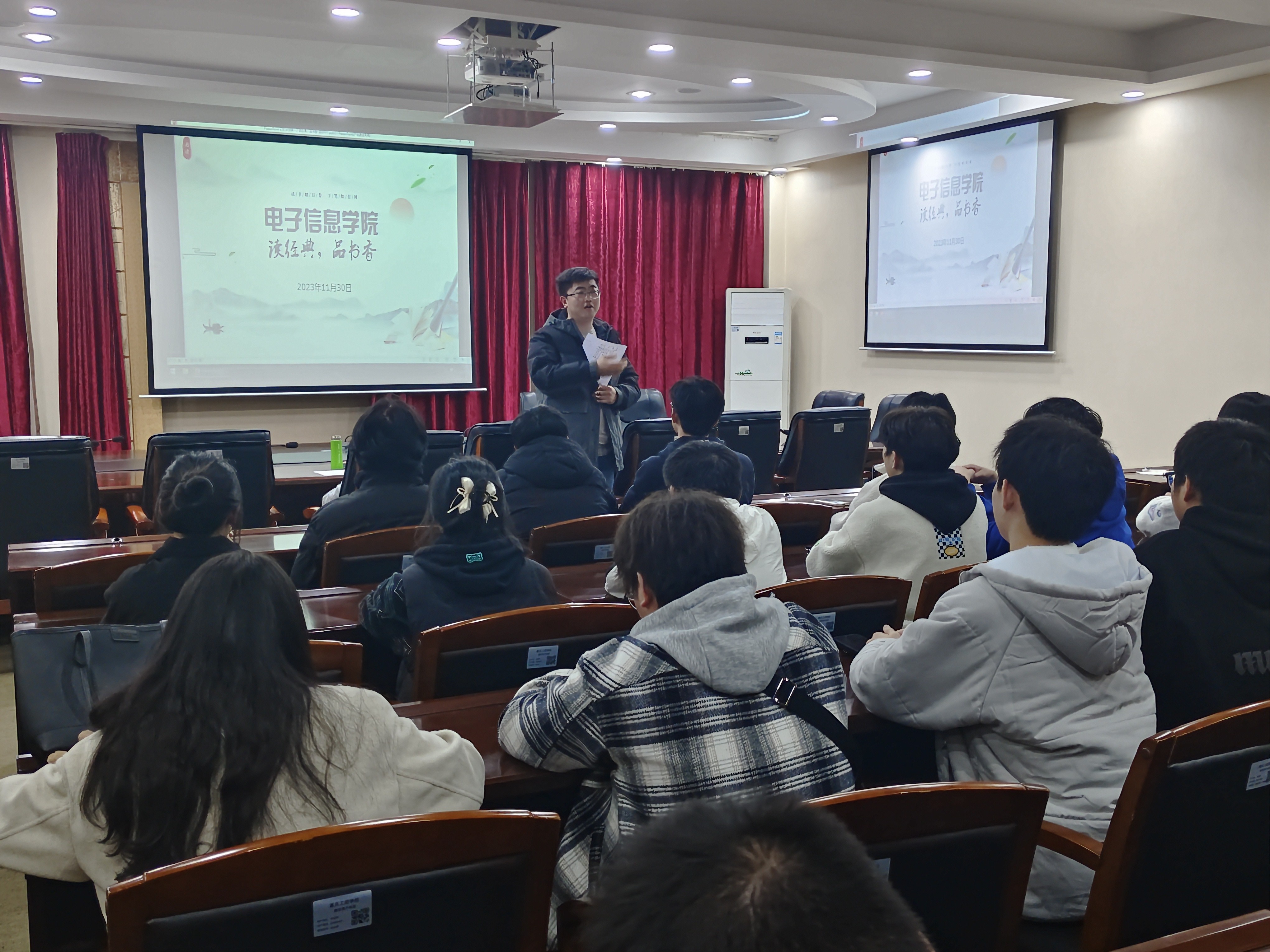 为了加强书香进学院建设,在院内形成热爱读书的良好风气,培养同学们浓厚的读书兴趣,电子信息学院于2023年11月30日晚上18:30在电子信息学院第七会议室开展了“读经典·品书香”的活动。