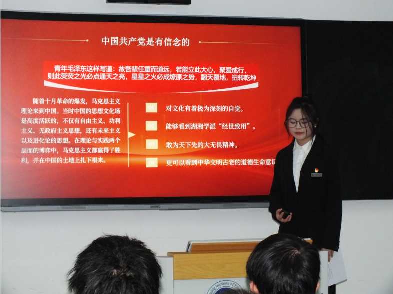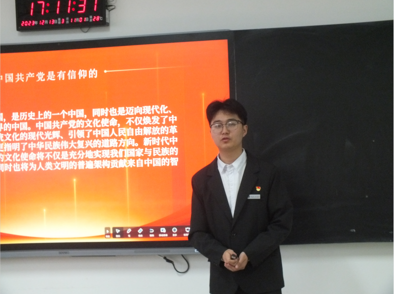 之后,党员学长进入班级,以“领航结对”为抓手,以“四红1+1”为载体,开展党员学长面对面和“红心向党”微党课宣讲活动,党员学长通过分享入党历程、学习经验,拉近与学弟学妹之间的距离;同时,党员学长结合自身学习感悟作《中国共产党的文化使命》主题宣讲,详细阐述了中国共产党是有信念的、有信仰的、有信心的,通过思想领航教育,让红色种子在学生心中生根发芽。