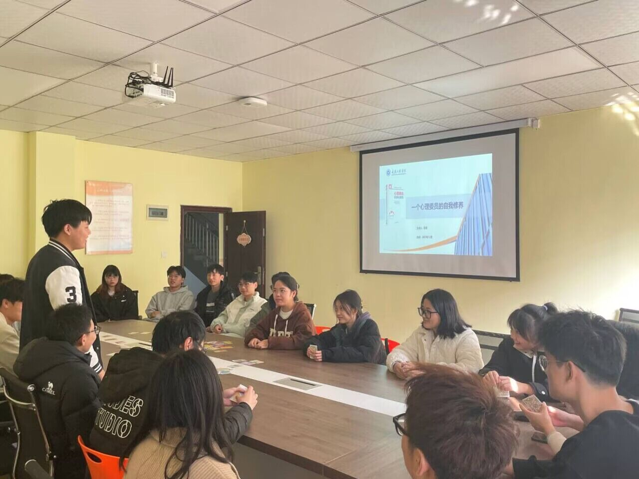 本期培训由张琼老师进行心理健康教育培训。张琼老师在培训中聚焦培养学生的心理保健意识和求助意识,引导学生正确认识自己的情绪和情感,学会调节情绪的方法,保持积极乐观的心态。随后张琼老师让同学们各自选择喜欢的OH卡牌进行自我介绍,通过随机组合的图卡和字卡,激发同学们个体潜意识,帮助个体更好的探索自己的内在世界,接着张琼老师带领着同学们依次体验了心理活动室道具,缓解同学们紧张情绪并释放压力。