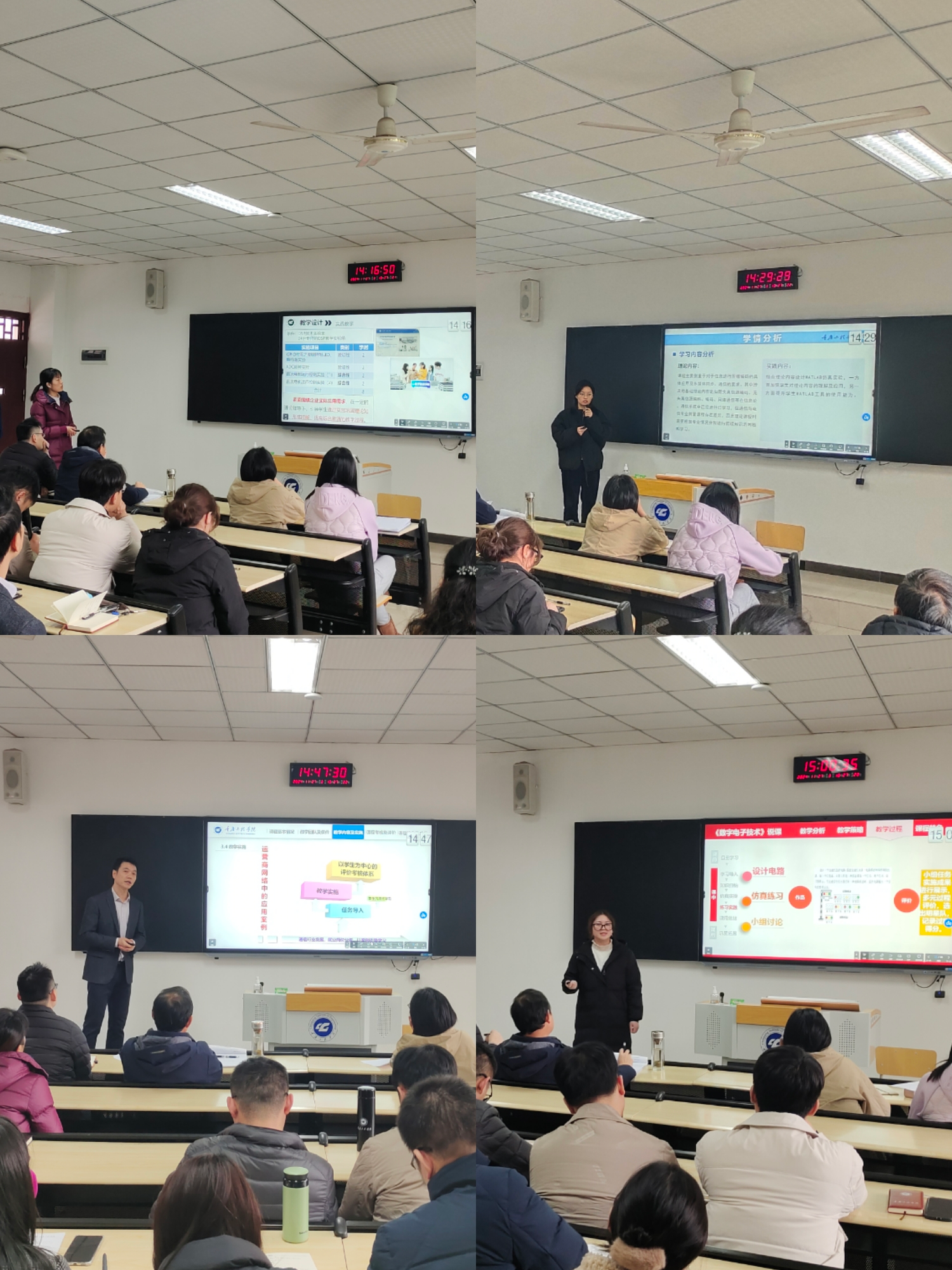 首先,钱助理介绍了本次活动的目的,旨在展示前期工作成果的基础上搭建老师们交流学习的重要平台,希望老师们认真参与,汲取有益经验。然后,四位参赛老师依次从教学分析、资源建设、课程实施、课程特色等方面进行了展示。最后,评委对参赛老师的表现作了总结性点评。何院长对老师们的辛勤付出表示感谢,并指出四位老师各有自己的优势,同时,他也对老师们的不足之处提出了一些建议,如,课程特色不在于多,而是要提升凝练;课程思政要找寻合适的点以求自然融入;学情分析应有助于推动教学开展,不能为了分析而分析。