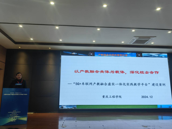 会议总结了一年来共同体的工作,在事先征集案例的基础之上,评选出“通信与信息类专业多链-递进-宏系统实验教学体系研究(电子科技大学)”“面向产教融合的通信与电子信息类‘实验-课程-教材’一体化建设(东北大学)”“光核心通信网络产教融合共同体(武汉理工大学)”“赋能新质生产力的5G+智能网联汽车垂直应用创新平台(重庆工程学院)”等16个年度典型案例,在大会上发布。大会选取6个优秀案例作经验分享。重庆工程学院作为共同体副理事长单位,电子信息学院院长何世彪,受邀在大会上做典型案例建设经验分享。