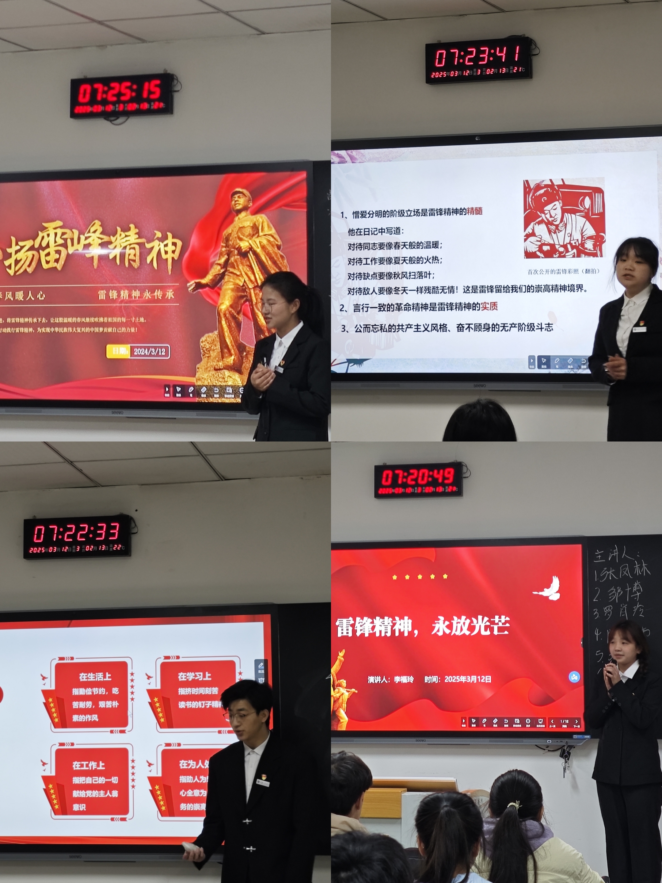 活动中,党员学长学姐们紧扣雷锋精神,结合自身经历分享感悟。一位学长讲述了在社区义务维修电子设备的经历,多次帮助居民解决家电故障,从居民的满意中体会到奉献的快乐,正如雷锋助人时的无私。另一位学姐分享了在团队项目中主动承担繁琐任务的故事,以雷锋 “干一行、爱一行、专一行、精一行”的态度,将负责部分做到极致,助力项目成功。他们鼓励学弟学妹从身边小事做起践行雷锋精神,无论是帮同学解决学习难题,还是投身志愿服务,点滴善举皆能汇聚温暖力量。