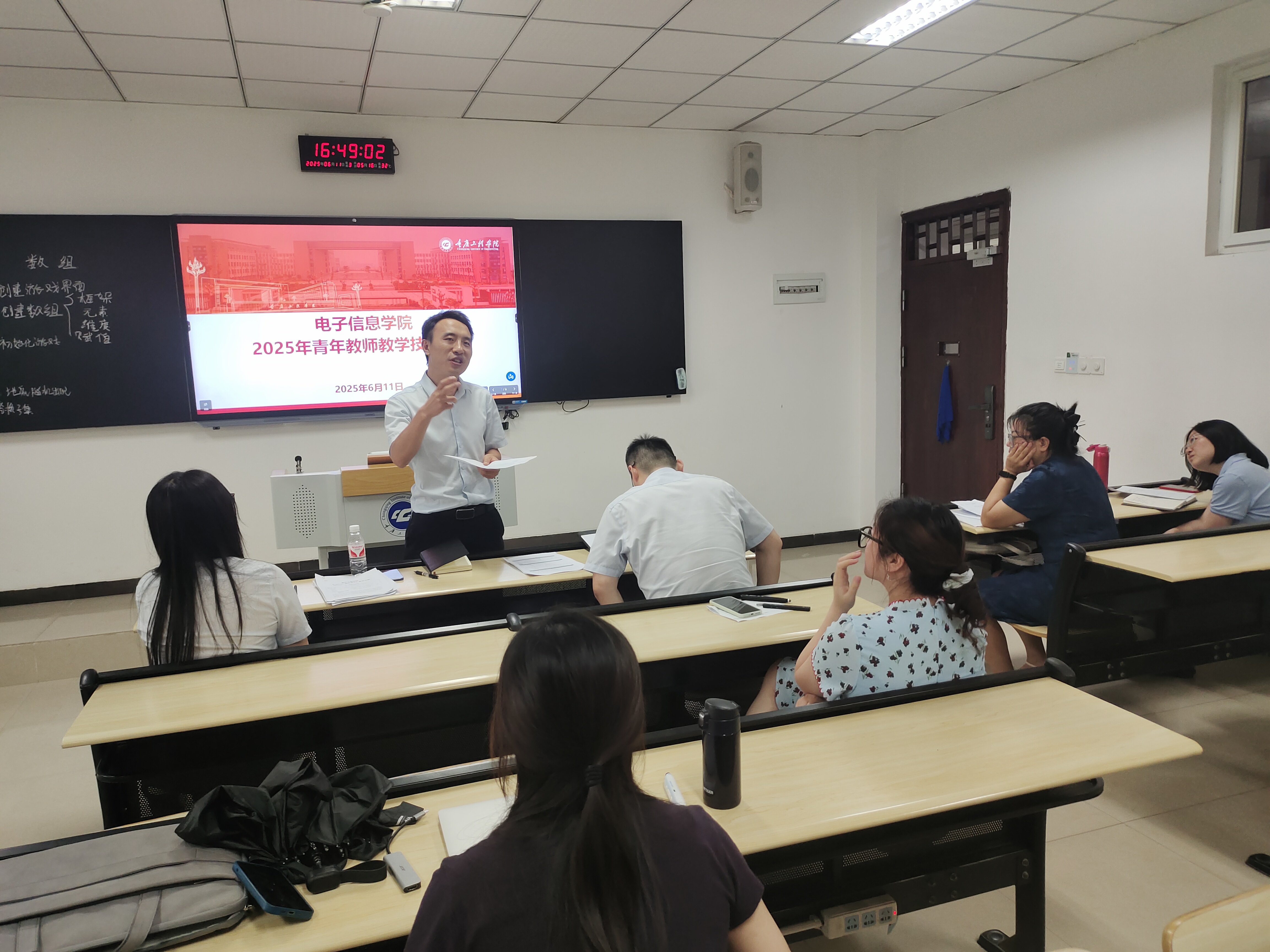 为推动青年教师更新教学理念,创新教学方法,提升教学技能,注重培养学生能力,实现以赛促教、以赛促学、以赛促发展的目标,61116时,电子信息学院在六教210开展了青年教师教学技能比赛。副院长景兴红、院长助理张仁永、系主任张冬雪、陈印、校督导杨剑利担任本次比赛评委。学院部分老师参加本次活动。