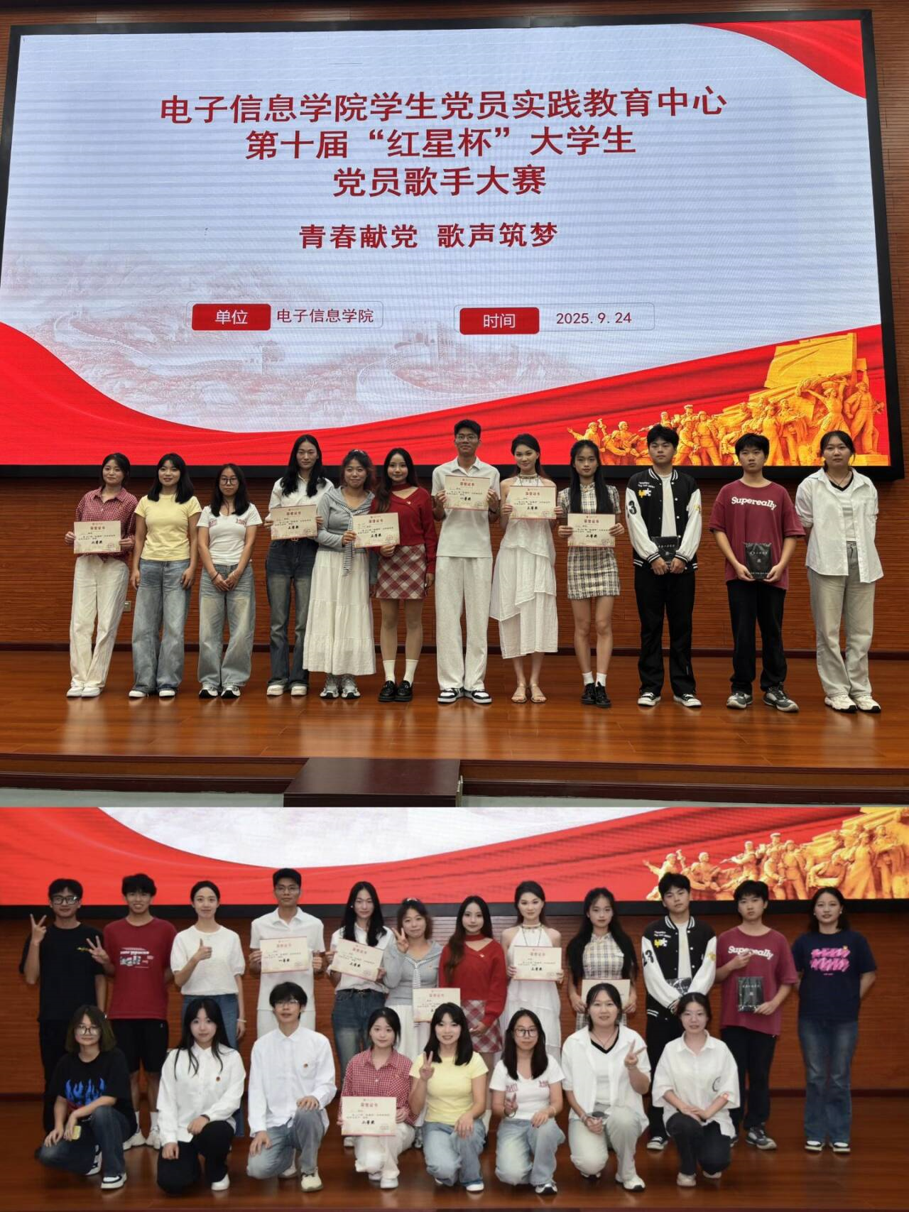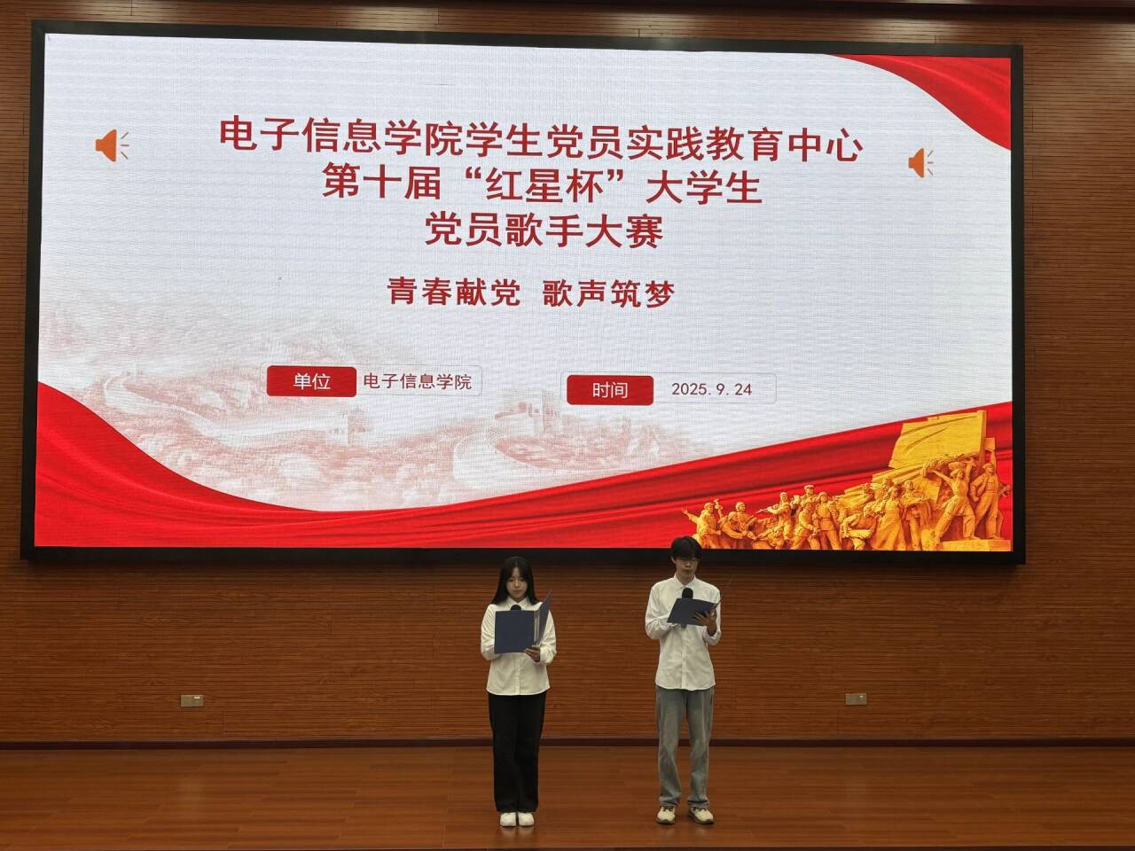 为传承红色基因,弘扬爱国主义精神,2025年9月24日,电子信息学院学生党员实践教育中心在7807报告厅举办第十届“红星杯”大学生党员歌手大赛初赛。共有120余人参与活动。