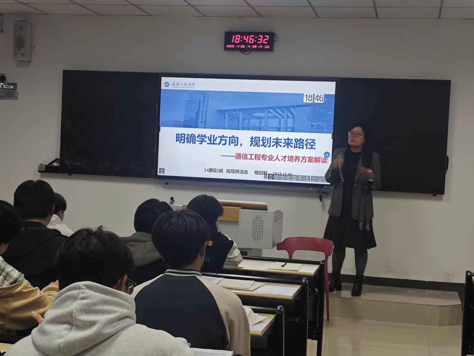 为帮助2024级通信工程专业新生全面了解本专业的培养目标、课程体系、毕业要求及发展方向,明确大学四年的学习任务与职业规划。2025年11月6日18:30,24通信2班班导师杨剑利老师在6213教室组织开展“明确学业方向,规划未来路径——通信工程专业人才培养方案解读”主题班导师活动。