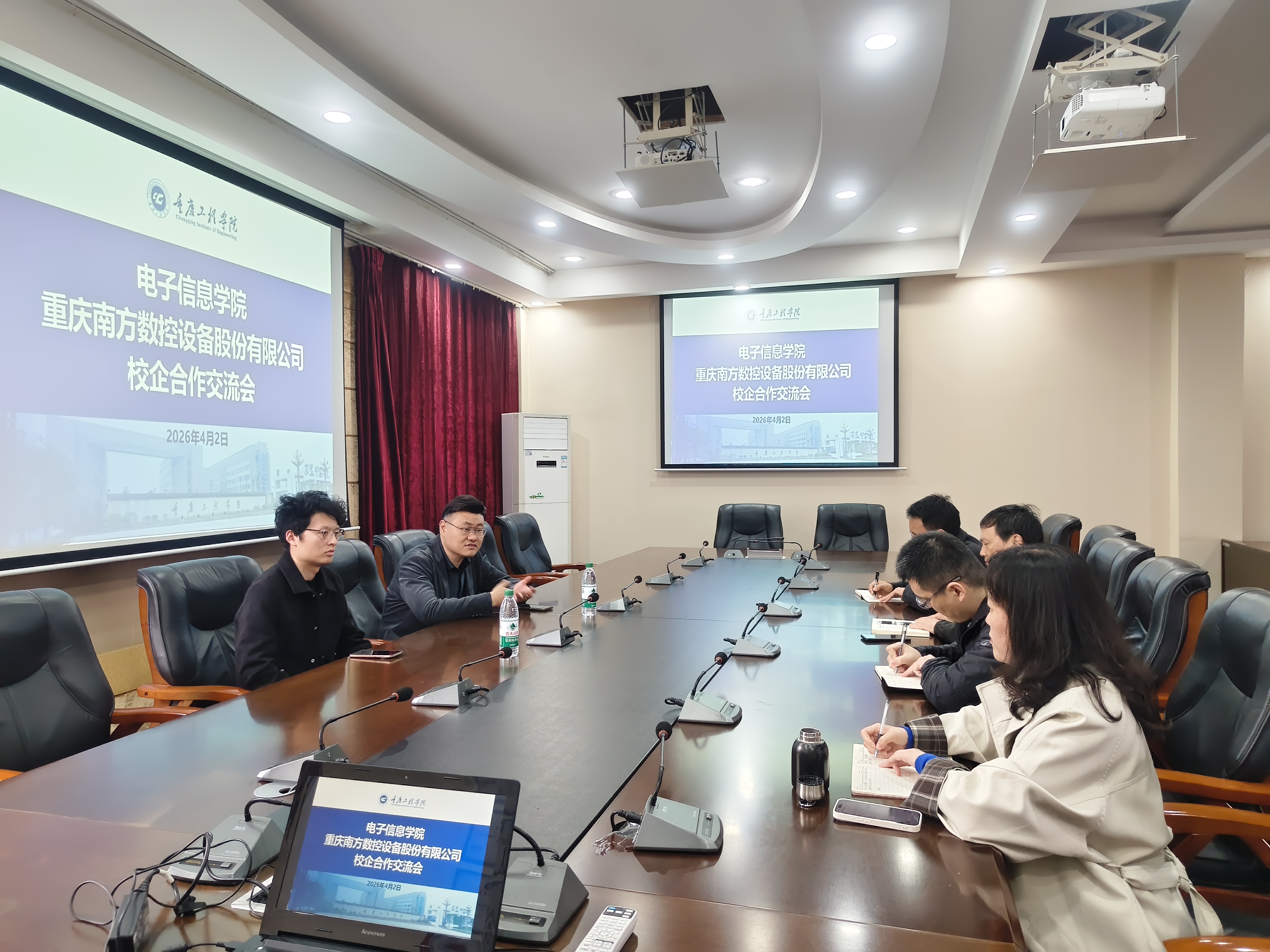 4 月 2 日,重庆南方数控设备股份有限公司运营总监杨总、验证部负责人陈经理一行到访电子信息学院,学院院长余成波教授、副院长景兴红、张仁永及就业科卢瑛热情接待。