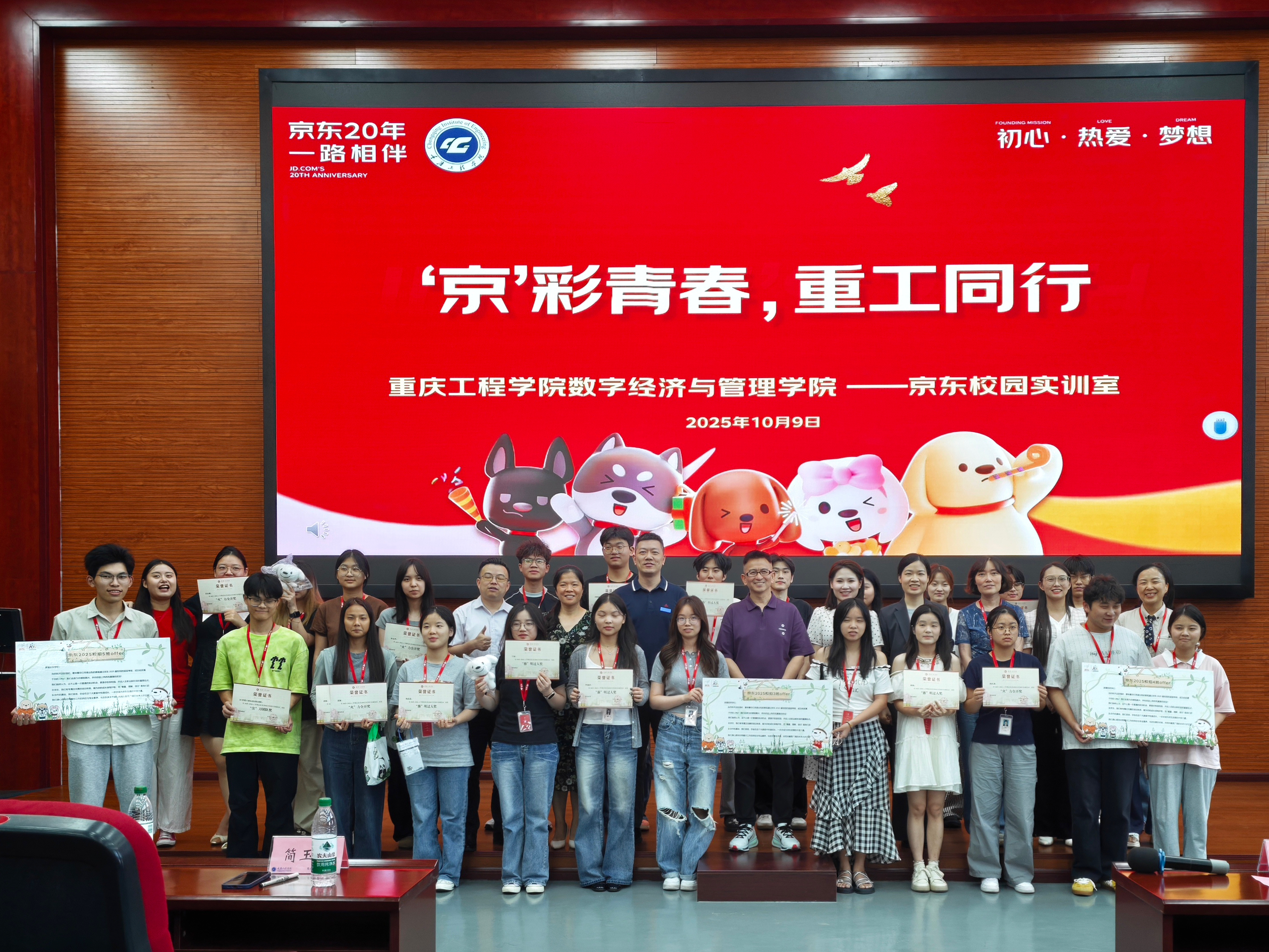 本报讯(图/文 胡杨利)2025年10月9日,重庆工程学院数字经济与管理学院在南泉校区第七教学楼7807教室,圆满举行了2025 年度“‘京’彩青春,重工同行”培训表彰暨实训启动会。活动旨在总结京东项目培训成果、表彰优秀学生,同时启动新年度校企合作实训,深化产教融合。