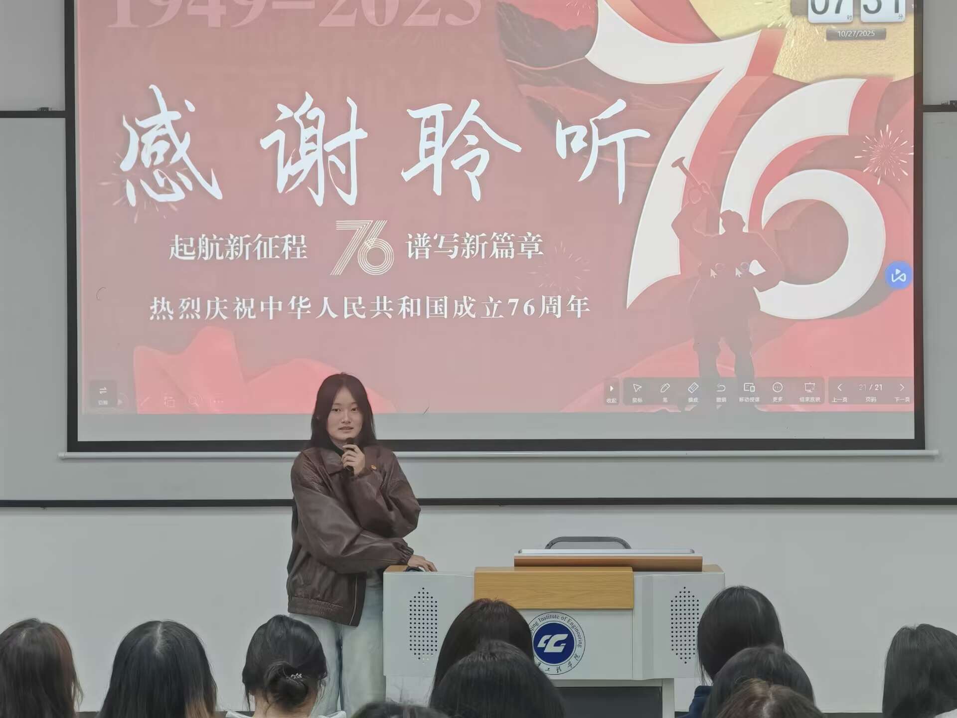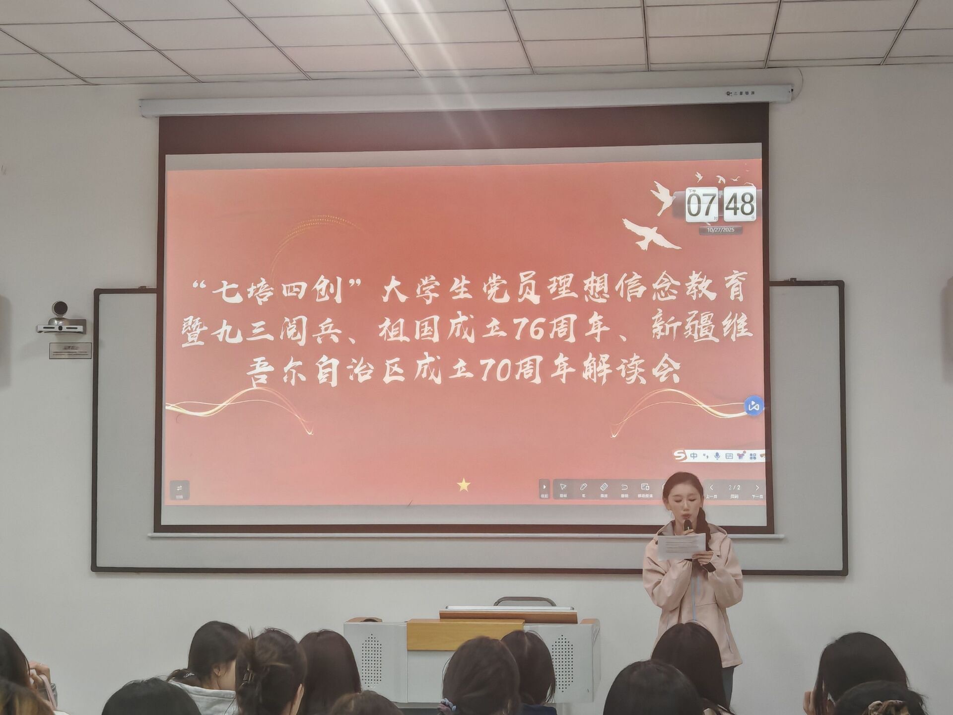 活动过程中,预备党员周静宜系统梳理新疆维吾尔自治区成立70年来在经济发展、生态建设等领域的跨越式成就,生动展现了在党的领导下,新疆各族人民同心同德、携手奋进的动人图景,让在场的同学们深刻体会到“民族团结是各族人民的生命线”。发展对象黎宏以新中国成立以来的多次阅兵盛典为切入点,传递出“铭记历史不是为了延续仇恨,而是为了守护来之不易的和平”的坚定信念。发展对象武小晗回顾新中国成立76年来的伟大成就,深入剖析中国特色社会主义制度“集中力量办大事”的显著优势,引导同学们深刻认识到“党的领导是中国特色社会主义最本质的特征,是实现中华民族伟大复兴的根本保证”。