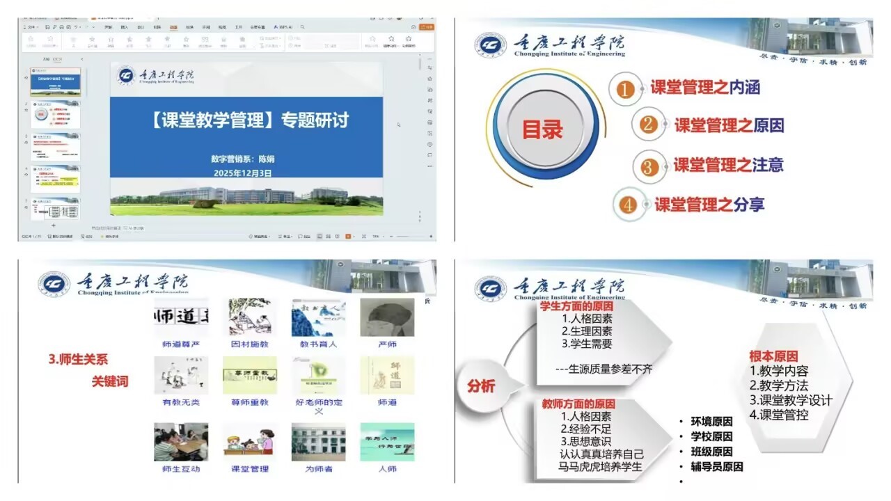 本网讯(文/图 施玲)为加强新教师队伍建设,提升课堂教学组织与管理能力,数字经济与管理学院于2025年12月3日通过线上会议的方式成功开展新教师“课堂教学管理”专题培训。本次培训由数字营销系陈娟老师主讲,学院全体新入职教师参加,旨在帮助新教师快速掌握课堂管理技巧,有效应对教学实践中的各类问题。