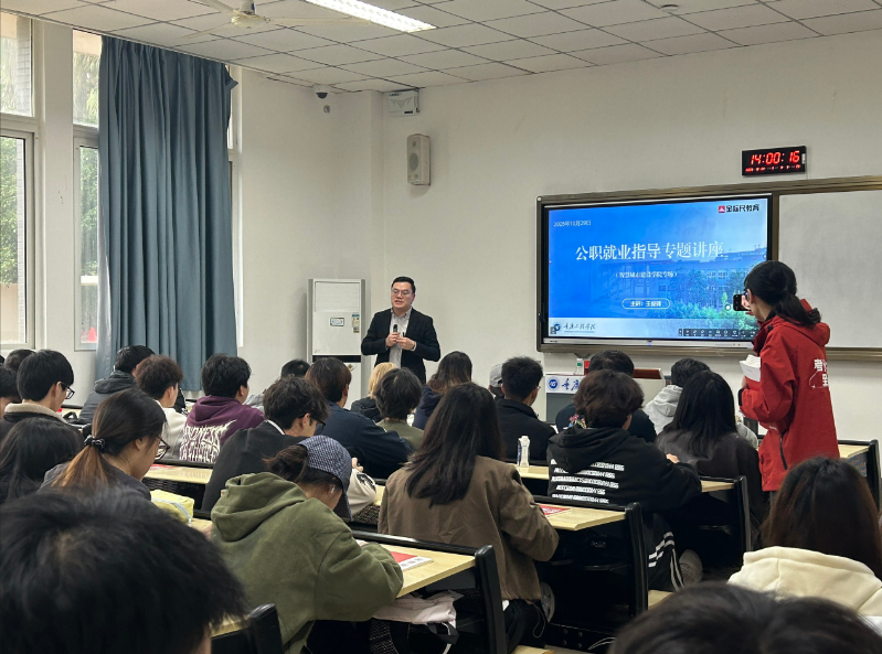 本网讯(文/图 胡璐玺) 10月29日下午,智慧城市建设学院在南泉校区第六教学楼6101成功举办了以“公考指导”为专题的讲座。活动特邀金标尺教育的王俊峰老师,为同学们带来了一场收获满满的指导会。