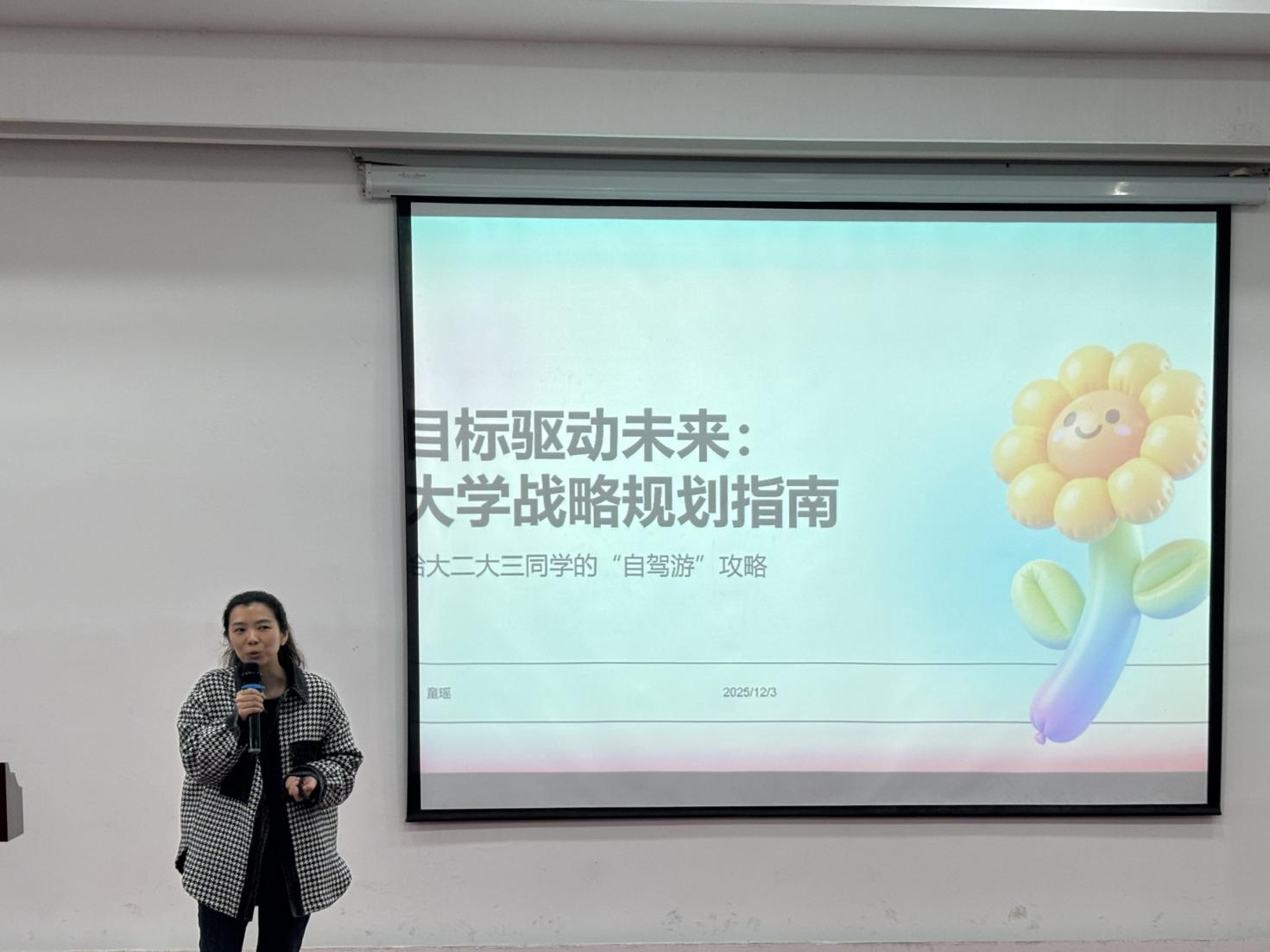 本网讯(文/周科成 图/朱秀潮 杨雨晴) 为帮助学生明确大学规划、突破成长瓶颈。智慧城市建设学院团委宣传部于12月3日在智慧城市建设学院办公楼三楼多功能厅开展“目标驱动未来:大学战略规划”主题活动。此次活动由我院高级工程师童瑶老师主讲,面向我院23级、24级全体学生。