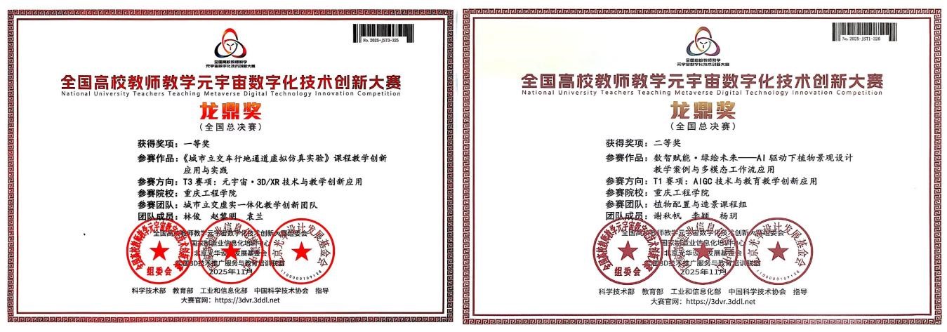 我院林俊团队携作品“《城市立交车行地通道虚拟仿真实验》课程教学创新应用与实践”参赛,荣获T3赛道“元宇宙·3D/XR技术与教育教学创新应用”全国总决赛一等奖;谢秋帆团队携作品“数智赋能·绿绘未来—AI驱动下植物景观设计教学案例与多模态工作流应用”参赛,荣获T1赛道“AIGC技术与教育教学创新应用”全国总决赛二等奖。