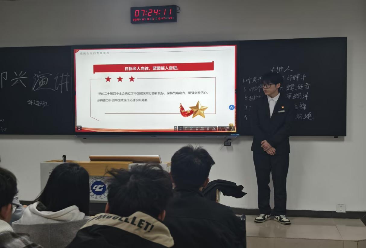 宣讲中,宣讲党员紧扣全会核心要义,结合“十五五”规划建议精神,回顾“十四五”时期我国经济社会与科技创新领域成就,重点解读“十五五”顶层设计与战略部署。围绕“高水平科技自立自强”“新质生产力培育”等关键议题,结合专业特色阐释行业发展与国家战略的关联,帮助同学们把握国家发展脉络,引导其将个人理想融入国家发展大局。