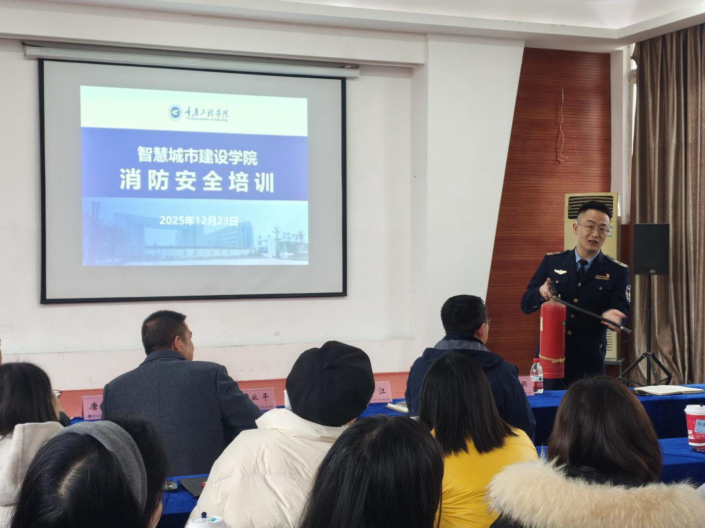 本网讯(图/吴俊峰 文/谭涵丹) 为了强化消防安全意识,普及火灾逃生自救知识,提升应对火灾风险的应急处置能力。智慧城市建设学院于12月23日下午在学院办公楼3楼多功能厅开展消防安全培训,特邀专业消防安全培训教官胡云波授课,学院全体教职工参会。