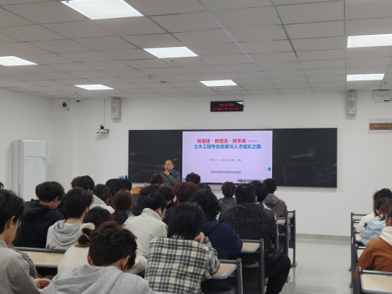 土木工程专业特邀重庆市规划和自然资源调查监测院副院长熊先才教授(工学博士、土木工程博士后)主讲,熊教授围绕国家十五五规划重大工程项目实际,着力从道路桥梁、新能源施工、城市更新与改造、工程检测与监测等领域进行深入解读。讲座过程中,指出土木工程专业学生不仅需要掌握建造、项目管理、安全管理等传统硬核技术,更要融入无人机检测、光伏施工、AIoT等新技术应用,成为集工程、数智与安全管理于一身的复合型工程师。