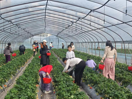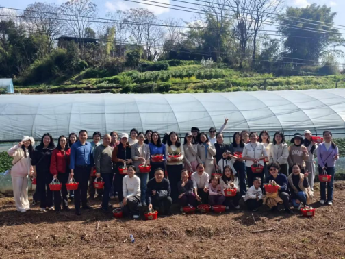 下午14时许,大家抵达位于巴南区南彭街道的草莓基地。踏入温暖的草莓大棚,清新果香扑面而来,一垄垄翠绿的植株间,鲜红饱满的草莓点缀其间,煞是喜人。在听取工作人员关于采摘技巧和注意事项的简要介绍后,大家便提着小篮兴致勃勃地投入田园怀抱。她们一边弯腰采摘,一边交流心得,欢声笑语在田垄间流淌。经过一小时的快乐劳作,每个人都收获了满满一篮的“甜蜜果实”。