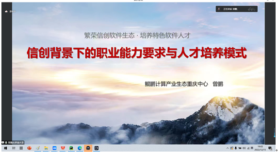 (图/文 刘燕)12月15日晚,计算机与物联网学院在腾讯会议举办专题讲座主题为:“信创背景下的职业能力要求与人才培养模式”,由鲲鹏计算产业生态重庆中心 人才培养&品牌部负责人、中软国际教育集团西南区域副总经理 曾鹏主讲,学院全体专任老师参加,黄胜老师主持。