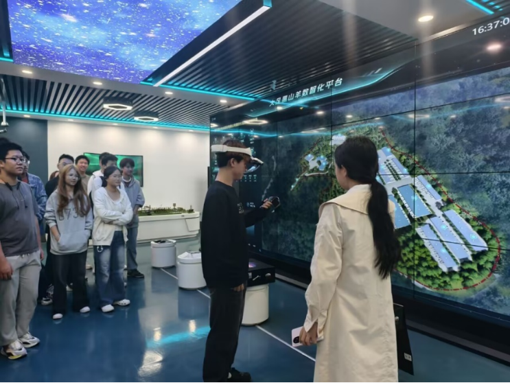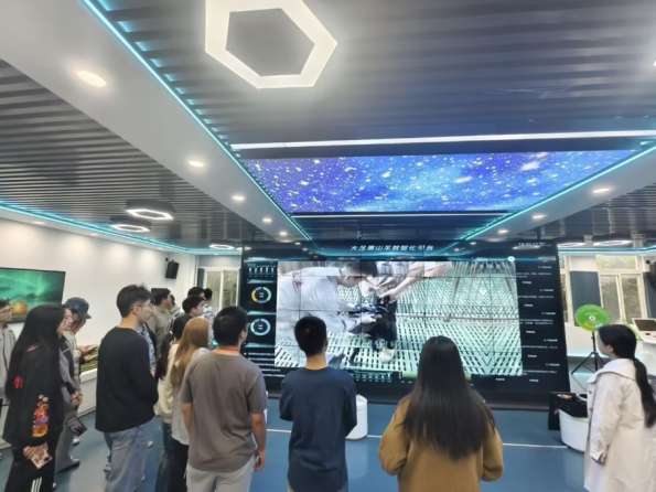 首先,围绕展厅内机械手臂、摩尔斯发报器、老式电话、MR一体机等设备进行简要介绍,帮助同学们快速建立对ICT技术发展脉络的整体认知。随后,讲解重点聚焦智慧养殖系统的大屏可视化模块。讲解员详细演示了由智慧农业产业学院中链农打造的大足黑山羊数智化平台,讲解其如何通过前后端技术集成物联网设备,实时采集养殖场数据、进行阈值预警,并联动控制摄像头、风机、传感器等设备,实现远程自动化管理。同时,以“石马镇”牧场为例,结合存栏量、出栏量等关键指标,解释了大屏如何助力养殖管理人员通过移动端查看实况、科学管控,让同学们直观感受ICT技术在智慧农业领域的应用价值。
