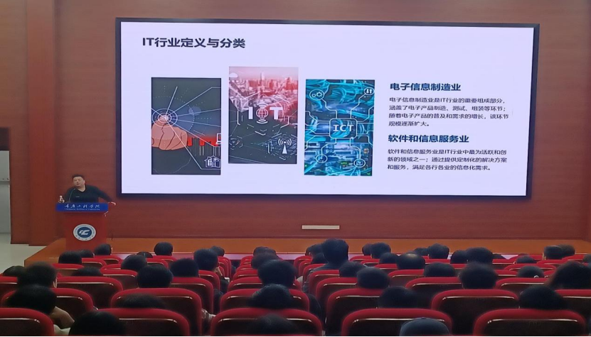 讲座伊始,曹经理首先围绕“IT行业定义与分类”展开分享,明确电子信息制造业与软件和信息服务业是IT领域的两大核心板块。随后,曹经理结合行业发展趋势,从职业能力储备、岗位选择方向、个人素养等维度,指导学生规划成长路径。结合IT行业人才需求分析,提到IT行业迭代速度快,需兼顾技术深耕与跨界学习,建议同学们在校期间通过项目实践积累经验,提升岗位适配度。