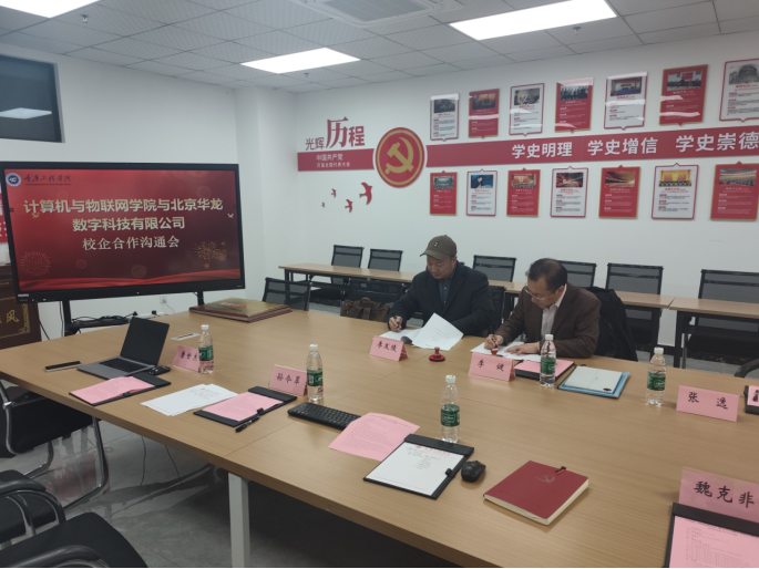 会议伊始,李发陵院长对学院的发展历程、专业设置、人才培养特色及产学研成果作了全面介绍,强调了学院在应用型人才培养和产业服务方面的定位与优势。随后,李健副总经理详细介绍了北京华龙数字科技有限公司的业务领域、技术实力与发展愿景,表达了企业与高校深度融合、共谋发展的积极意愿。